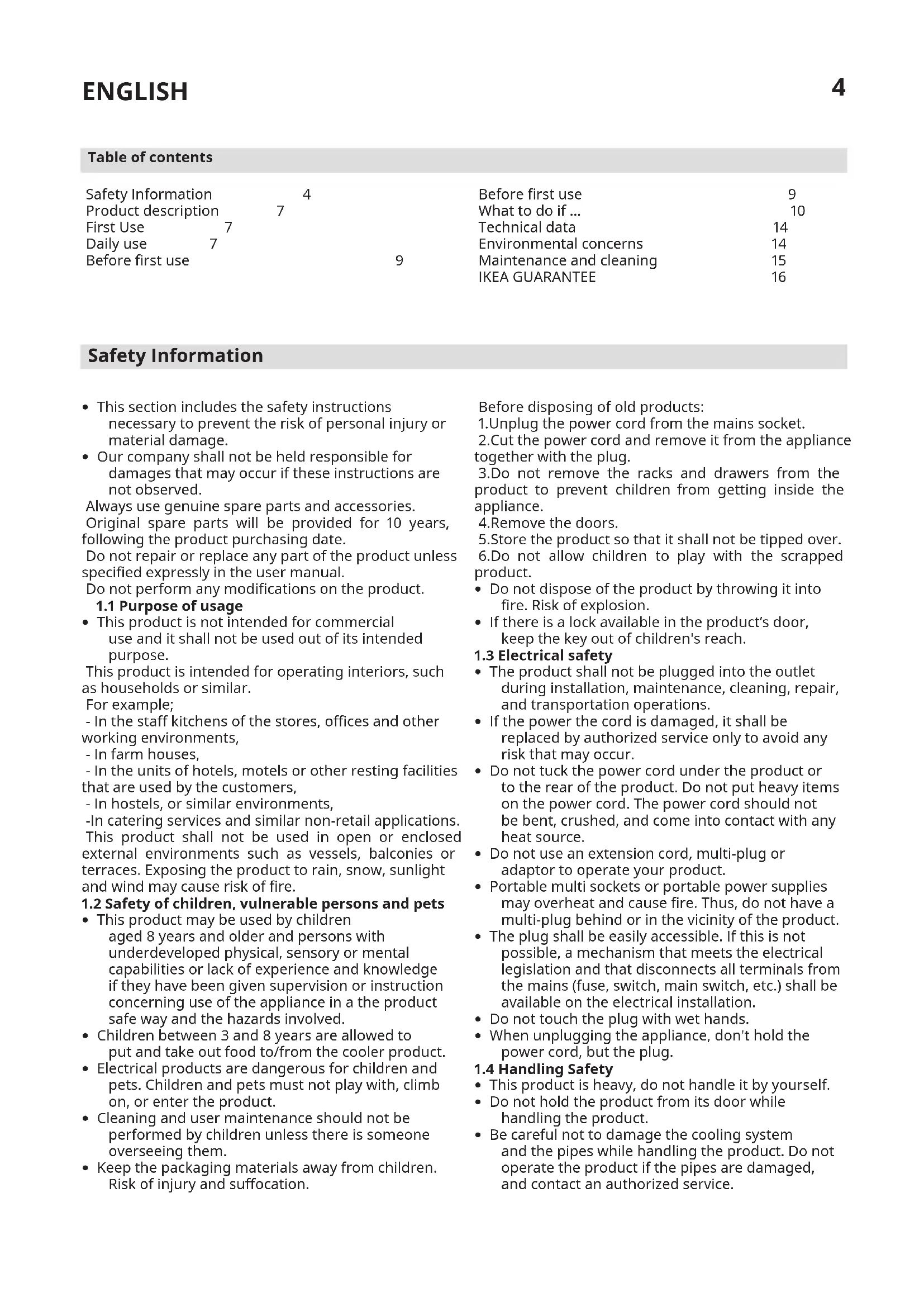 Safety Information 4 Product description 7 First Use 7 Daily use 7 Before first use 9 Table of contents Before first use 9 What to do if ... 10 Technical data 14 Environmental concerns 14 Maintenance and cleaning 15 IKEA GUARANTEE 165 ENGLISH