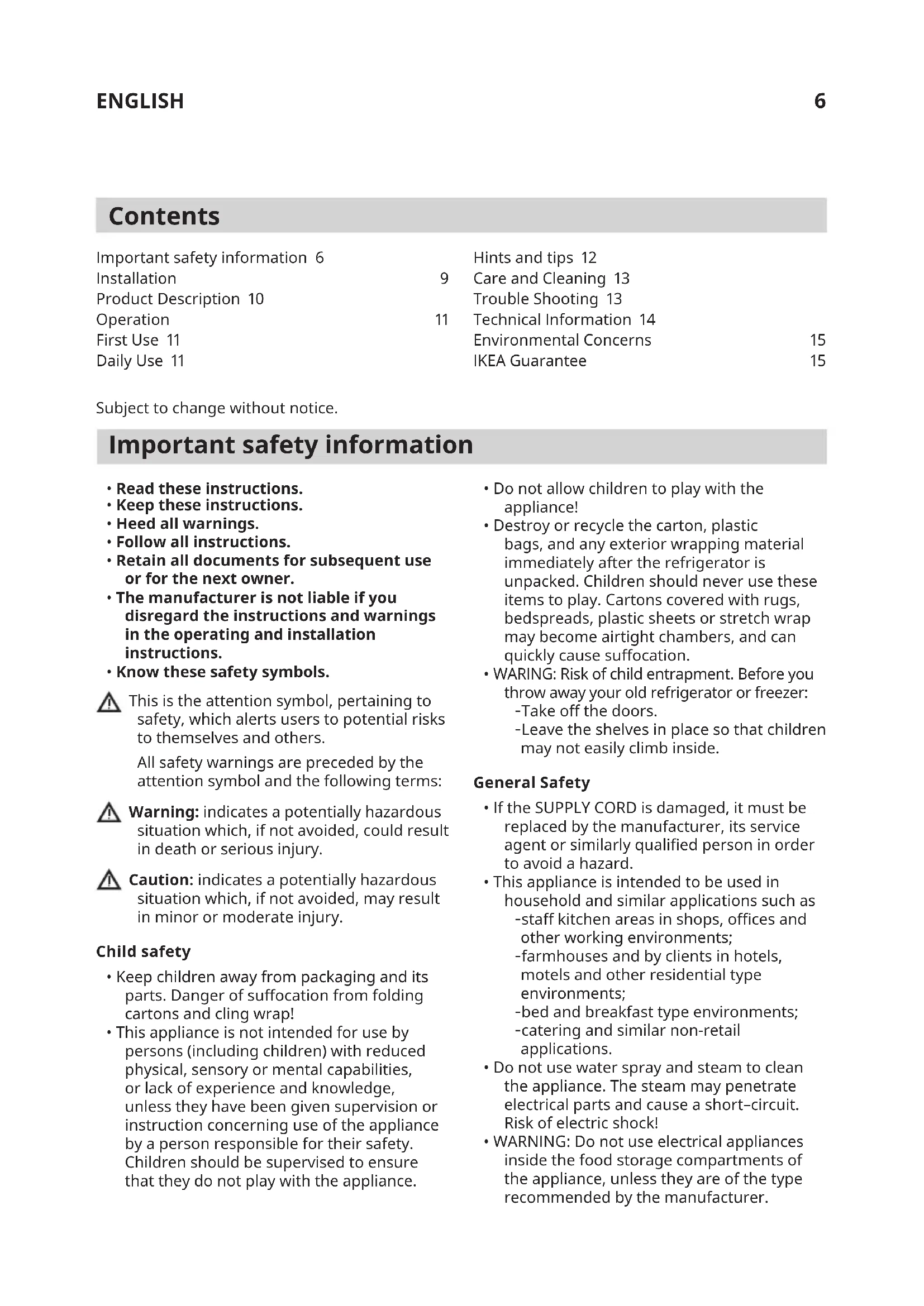 - WARNING: Do not use electrical appliances inside the food storage compartments of the appliance, unless they are of the type recommended by the manufacturer. Hints and tips 12 Care and Cleaning 13 Trouble Shooting 13 Technical Information 14 Environmental Concerns 15 IKEA Guarantee 15ENGLISH 7