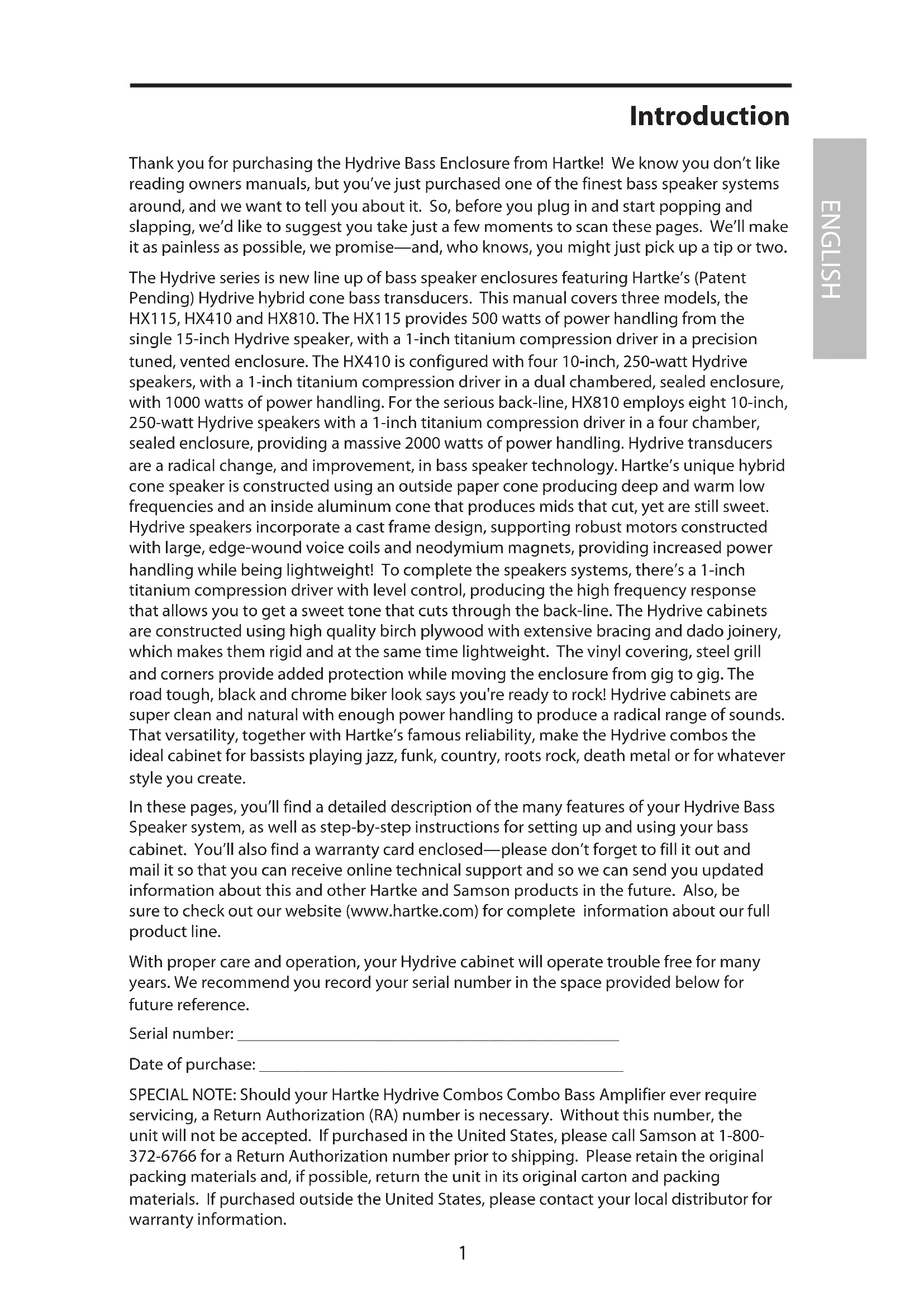 In these pages, you'll find a detailed description of the many features of your Hydrive Bass Speaker system, as well as step-by-step instructions for setting up and using your bass cabinet. You'll also find a warranty card enclosed—please don't forget to fill it out and mail it so that you can receive online technical support and so we can send you updated information about this and other Hartke and Samson products in the future. Also, be sure to check out our website (www.hartke.com) for complete information about our full product line.