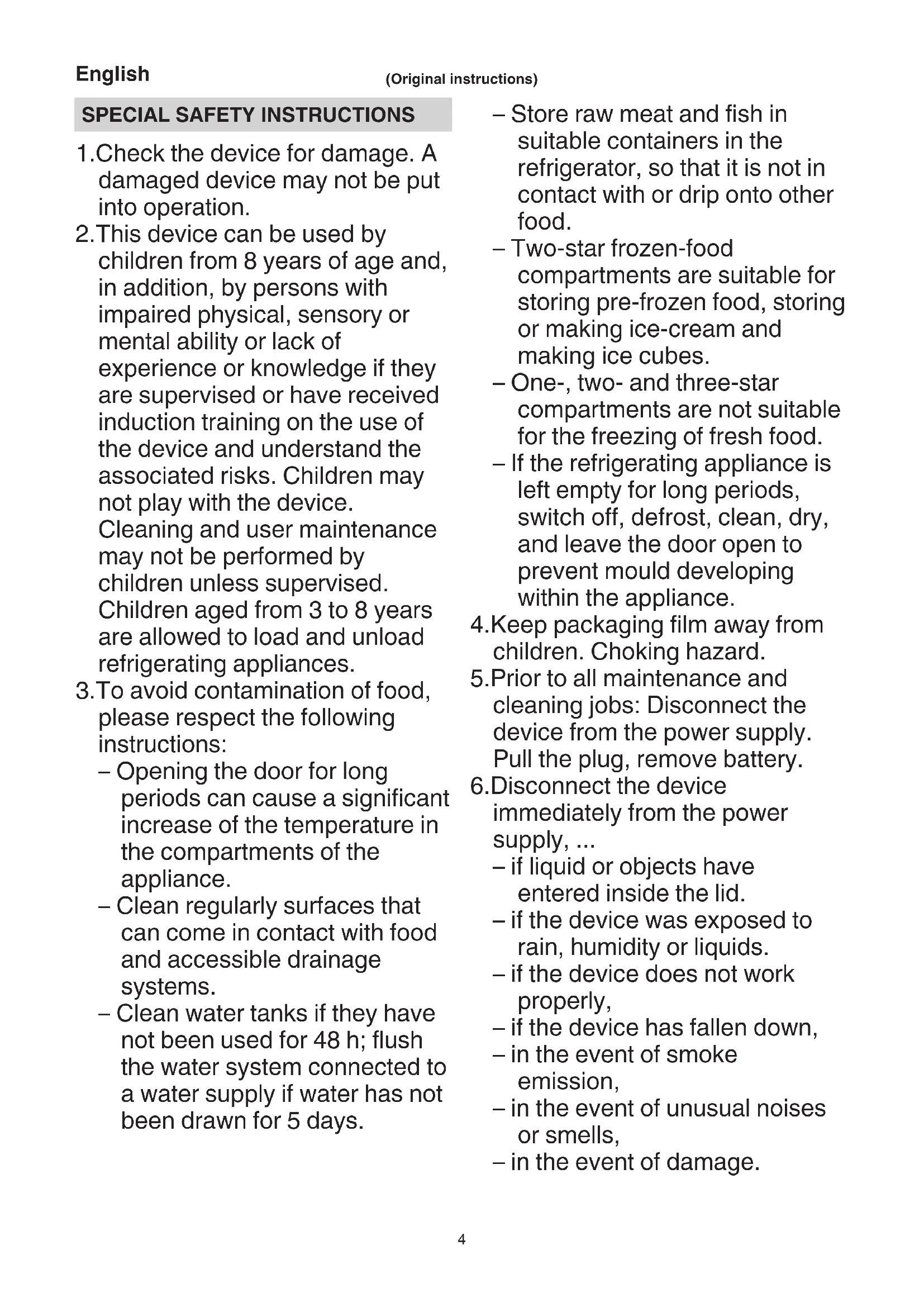 instructions must be observed: – If the lid is opened for an extended period of time, there may be a significant rise in temperature in the compartments of the device. – Store raw meat and fish in suitable containers so that it does not touch or drip onto other food. – Regularly clean surfaces that may come into contact with food. – If the device is left empty for an extended period of time, switch off the device, defrost it, clean it and leave the lid open to prevent mould growth.
