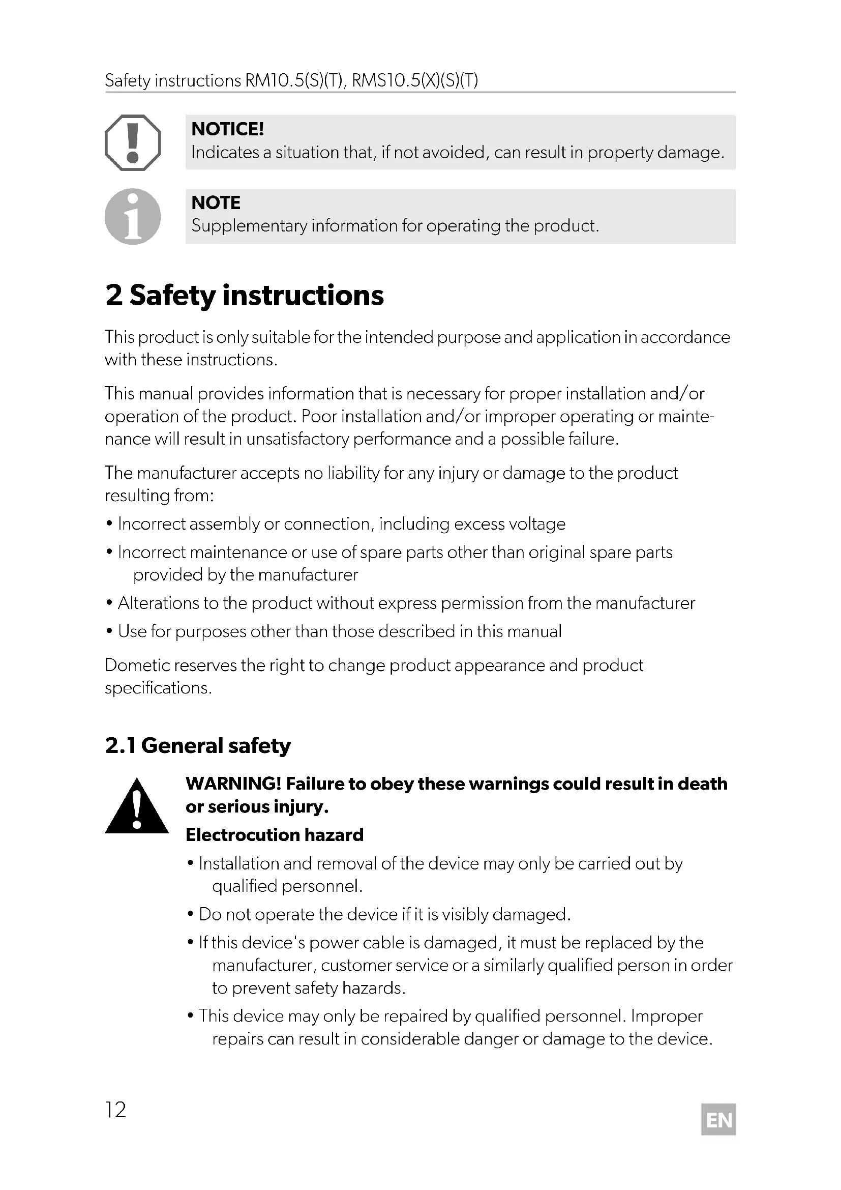- This device may only be repaired by qualified personnel. Improper repairs can result in considerable danger or damage to the device. NOTICE! Indicates a situation that, if not avoided, can result in property damage. NOTE Supplementary information for operating the product.EN RM10.5(S)(T), RMS10.5(X)(S)(T) Safety instructions