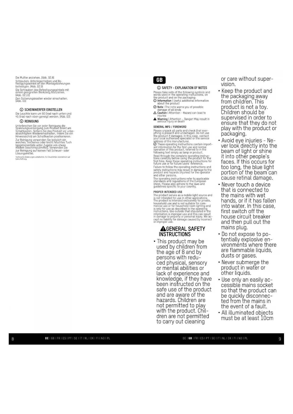 Please unpack all parts and check that everything is present and undamaged. Do not use the product if damaged. In this case, contact your local authorised specialist or the service address of the manufacturer. These operating instructions contain important information for the first use and normal operation of this product, referred to in the following text simply as lamp or product. Read through the complete operating instructions carefully before using the product for the first time. Keep these operating instructions for future use or for 'future users' reference. Failure to follow the operating instructions and safety instructions may result in damage to the product and hazards [injuries] for the operator and other persons.