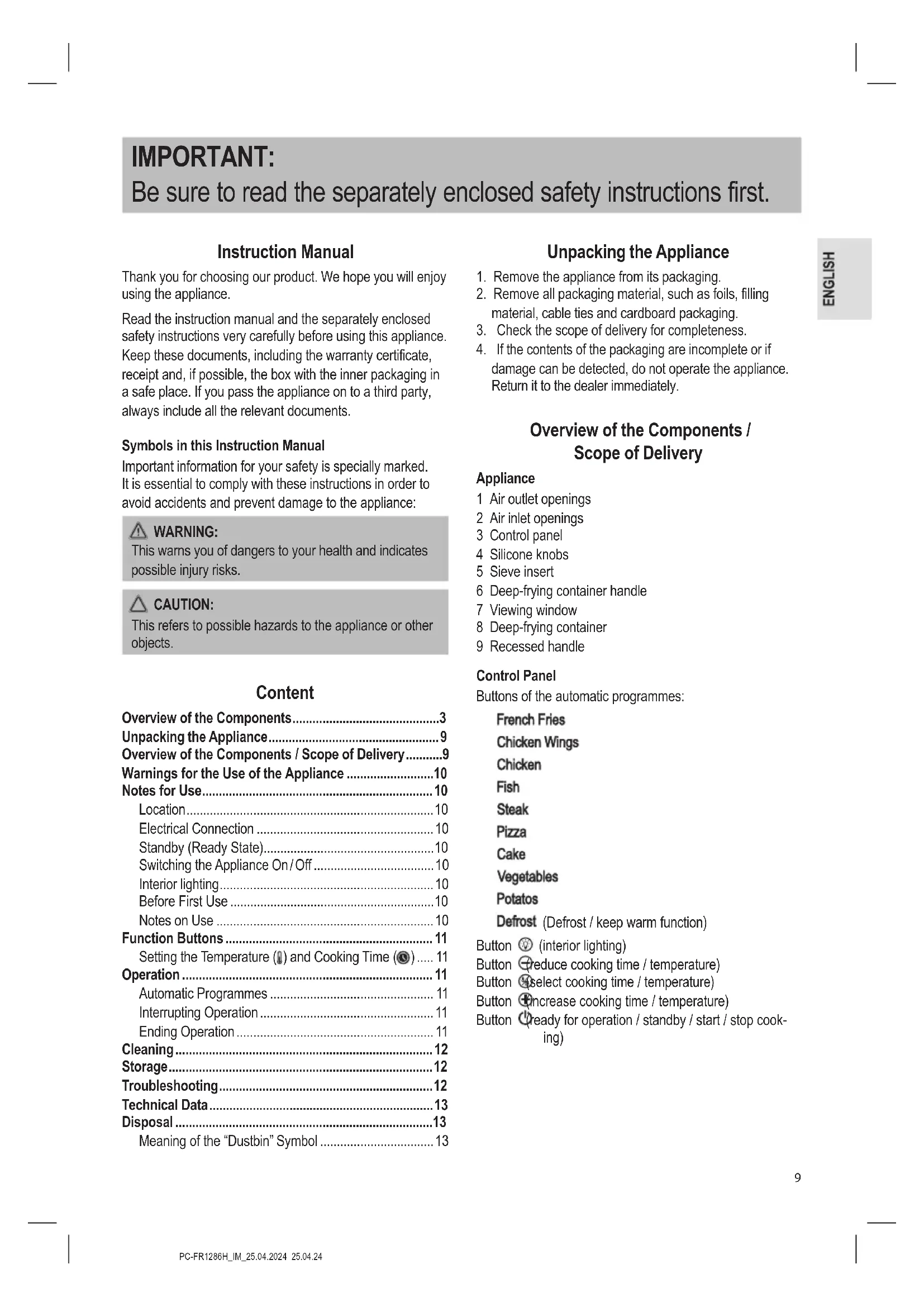 damage can be detected, do not operate the appliance. Return it to the dealer immediately. Overview of the Components / Scope of Delivery Appliance 1 Air outlet openings 2 Air inlet openings 3 Control panel 4 Silicone knobs 5 Sieve insert 6 Deep-frying container handle 7 Viewing window 8 Deep-frying container 9 Recessed handle Control Panel Buttons of the automatic programmes: (Defrost / keep warm function) Button (interior lighting) Button (reduce cooking time / temperature) Button (select cooking time / temperature) Button (increase cooking time / temperature) Button (ready for operation / standby / start / stop cook- ing)PC-FR1286H_IM_25.04.2024 25.04.24