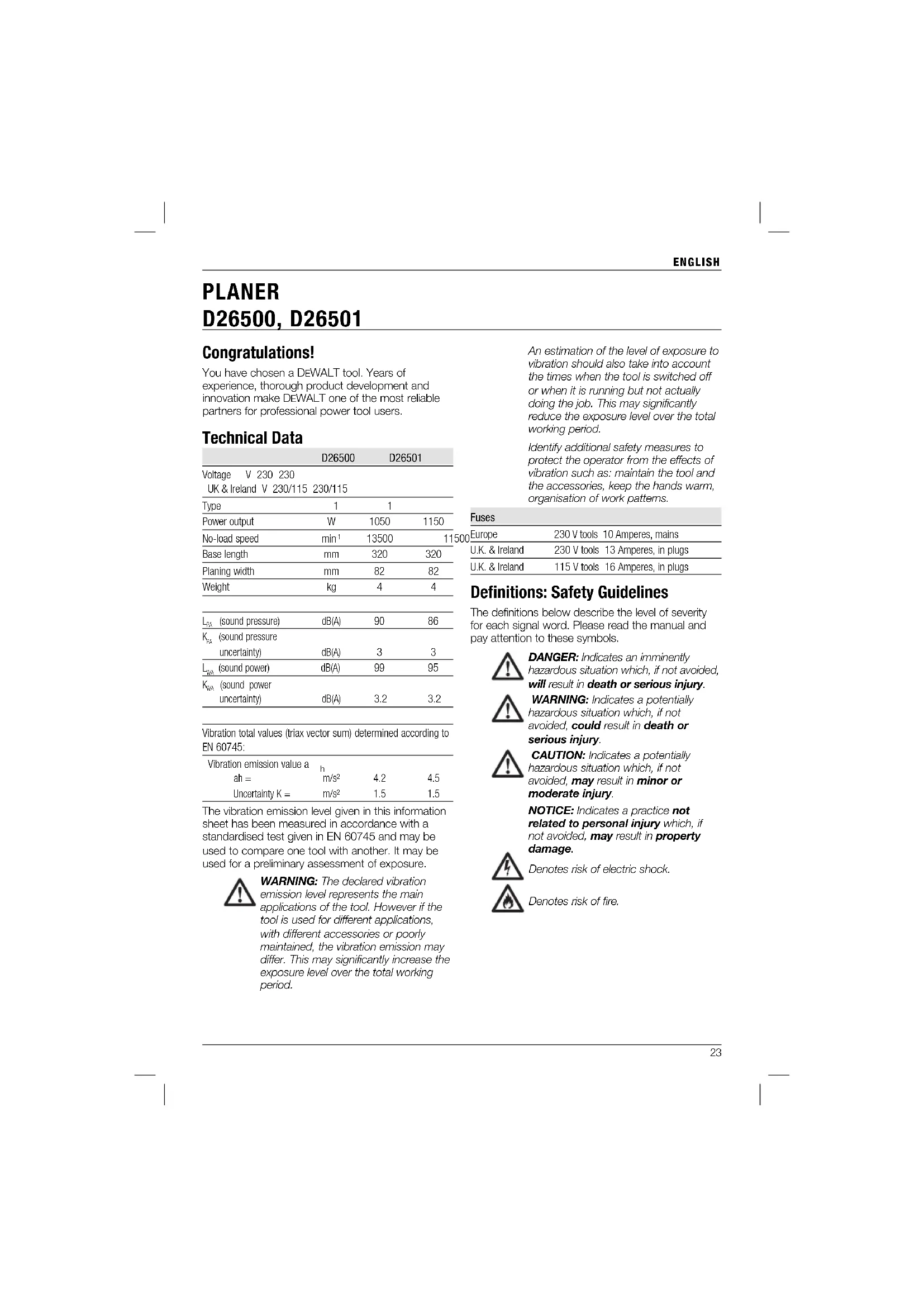 PLANER D26500, D26501 Congratulations! You have chosen a DEWALT tool. Years of experience, thorough product development and innovation make DEWALT one of the most reliable partners for professional power tool users. Technical Data D26500 D26501 Voltage V 230 230 UK & Ireland V 230/115 230/115 Type 1 1 Power output W 1050 1150 No-load speed min