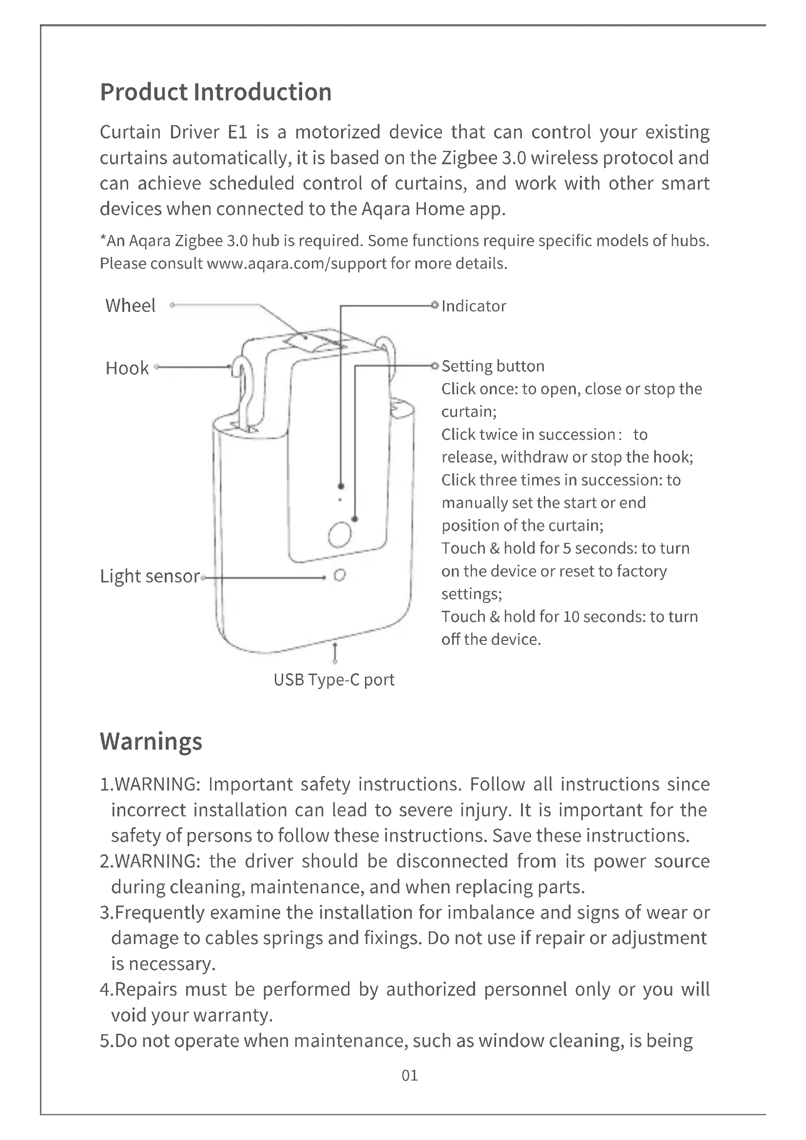 Indicator Setting button USB Type-C port Hook Wheel Light sensor Click once: to open, close or stop the curtain; Click twice in succession:to release, withdraw or stop the hook; Click three times in succession: to manually set the start or end position of the curtain; Touch & hold for 5 seconds: to turn on the device or reset to factory settings; Touch & hold for 10 seconds: to turn o the device. Product Introduction Curtain Driver E1 is a motorized device that can control your existing curtains automatically, it is based on the Zigbee 3.0 wireless protocol and can achieve scheduled control of curtains, and work with other smart devices when connected to the Aqara Home app. *An Aqara Zigbee 3.0 hub is required. Some functions require specific models of hubs. Please consult www.aqara.com/support for more details.Please scan the QR code below to view the installation and operation guide video. If the video is unable to be reached, you can also install the product according to the method described in the manual.