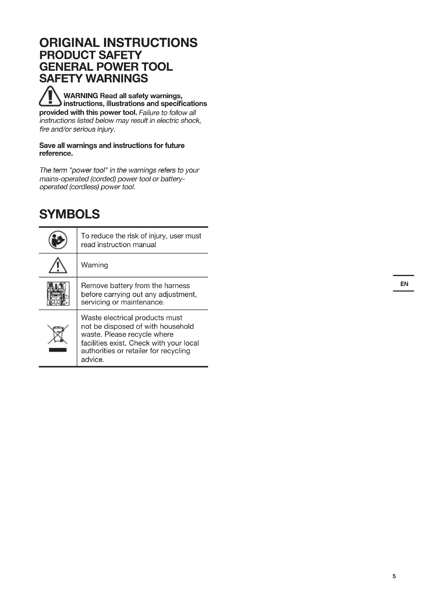 SAFETY WARNINGS WARNING Read all safety warnings, instructions, illustrations and specifications provided with this power tool. Failure to follow all instructions listed below may result in electric shock, re and/or serious injury. Save all warnings and instructions for future reference. The term "power tool" in the warnings refers to your mains-operated (corded) power tool or battery- operated (cordless) power tool. SYMBOLS To reduce the risk of injury, user must read instruction manual Warning