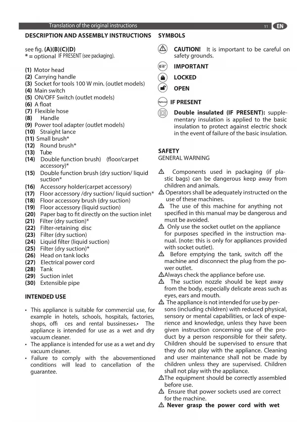 - = optional IF PRESENT (see packaging). (1) Motor head (2) Carrying handle (3) Socket for tools 100 W min. (outlet models) (4) Main switch (5) ON/OFF Switch (outlet models) (6) A oat (7) Flexible hose (8) Handle (9) Power tool adapter (outlet models) (10) Straight lance (11) Small brush* (12) Round brush* (13) Tube (14) Double function brush) (oor/carpet accessory)* (15) Double function brush (dry suction/ liquid suction* (16) Accessory holder(carpet accessory) (17) Floor accessory /dry suction/ liquid suction* (18) Floor accessory brush (dry suction) (19) Floor accessory (liquid suction) (20) Paper bag to t directly on the suction inlet (21) Filter (dry suction)* (22) Filter-retaining disc (23) Filter (dry suction) (24) Liquid lter (liquid suction) (25) Filter (dry suction)* (26) Head on tank locks (27) Electrical power cord (28) Tank (29) Suction inlet (30) Extensible pipe INTENDED USE