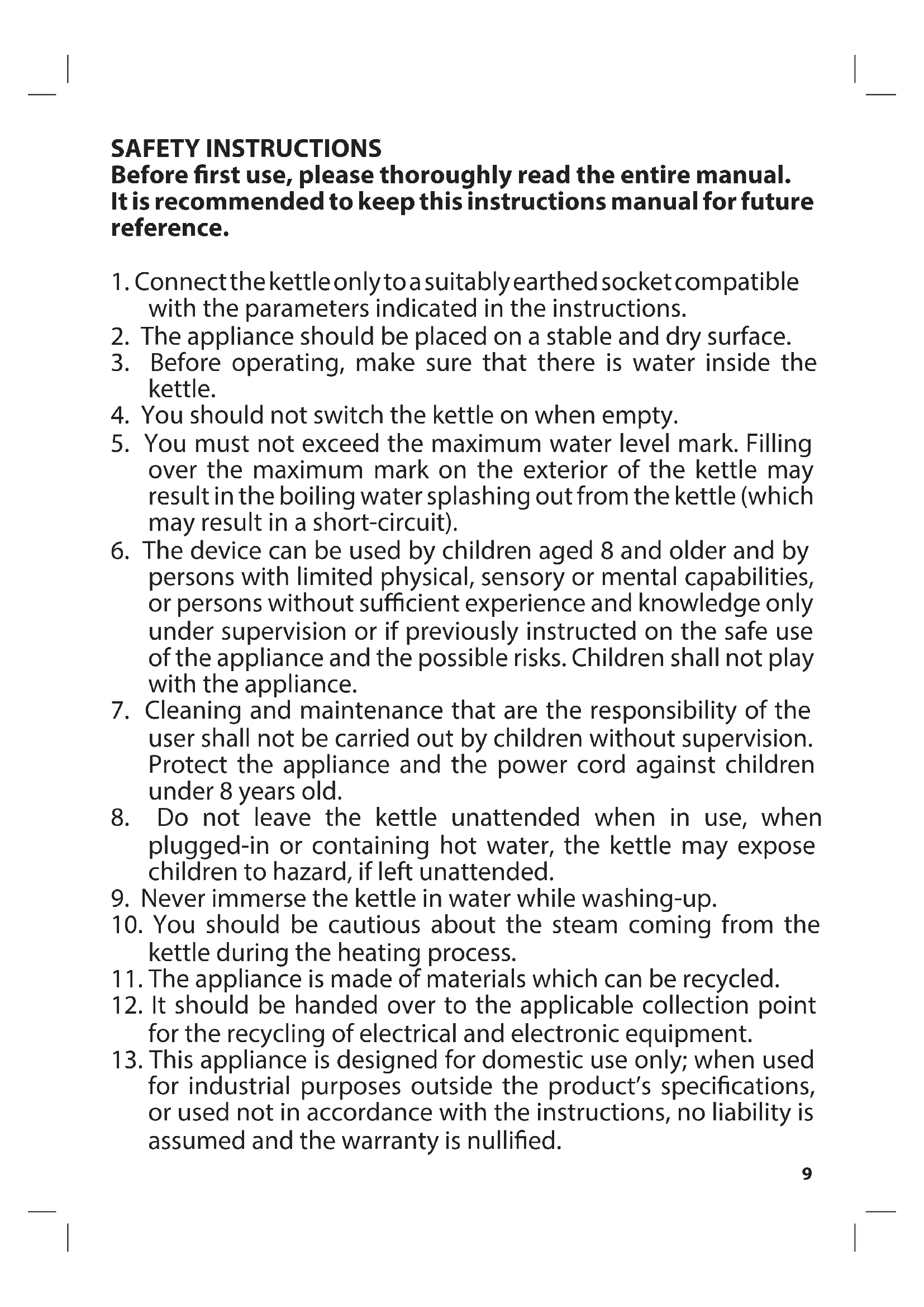 - Regularly remove limestone from surfaces that come into contact with water while the device is in use. Use citric acid-based agents to decalcize surfaces. The recommendations of the descaling agent manufacturer should be followed. When descaling the heater (6), special care must be taken to prevent the agent from entering the appliance. WARNING! The descaling agent must not be heated in the appliance. ENVIRONMENTAL PROTECTION