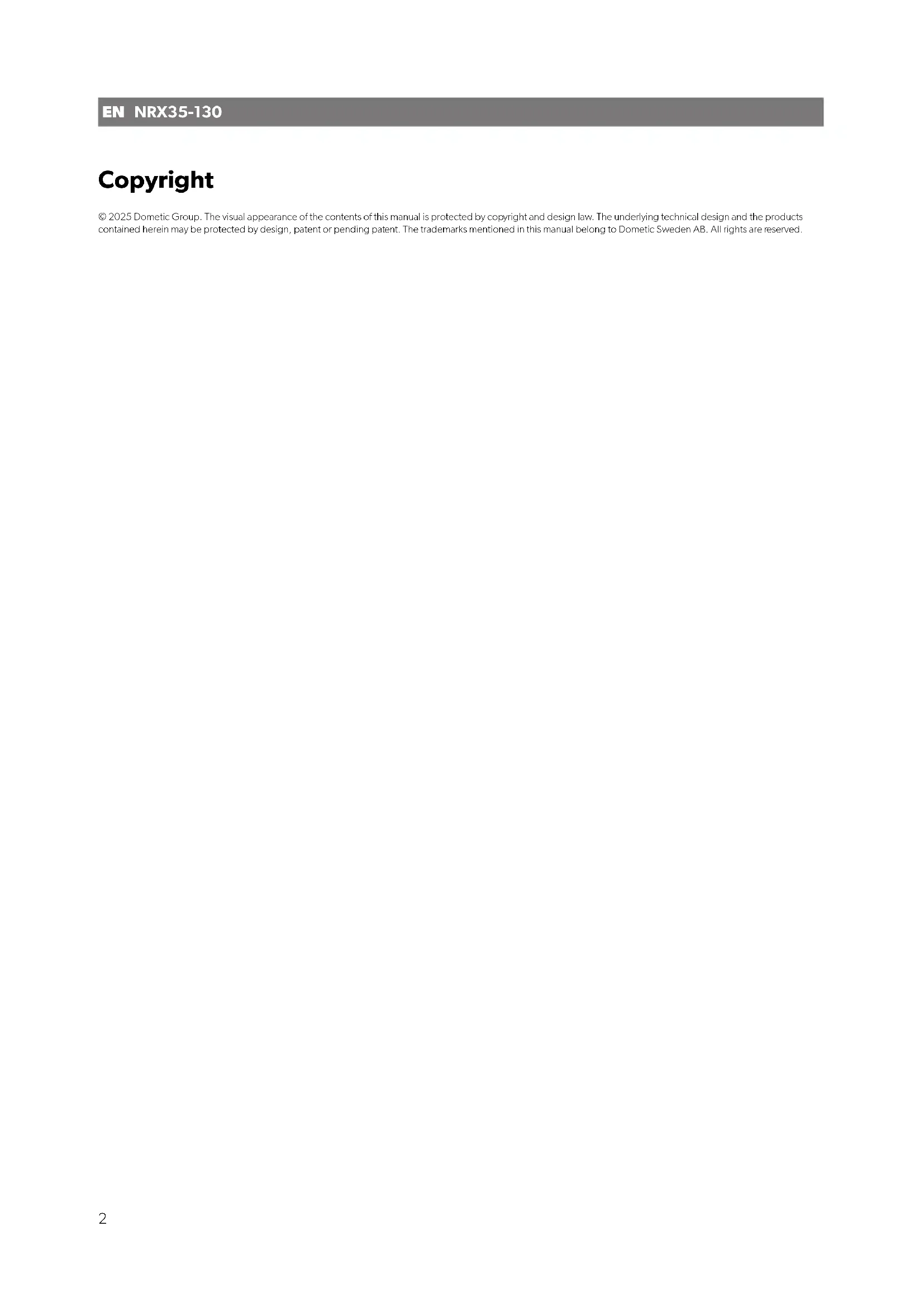 ENNRX35-130 Copyright © 2025 Dometic Group. The visual appearance of the contents of this manual is protected by copyright and design law. The underlying technical design and the products contained herein may be protected by design, patent or pending patent. The trademarks mentioned in this manual belong to Dometic Sweden AB. All rights are reserved.