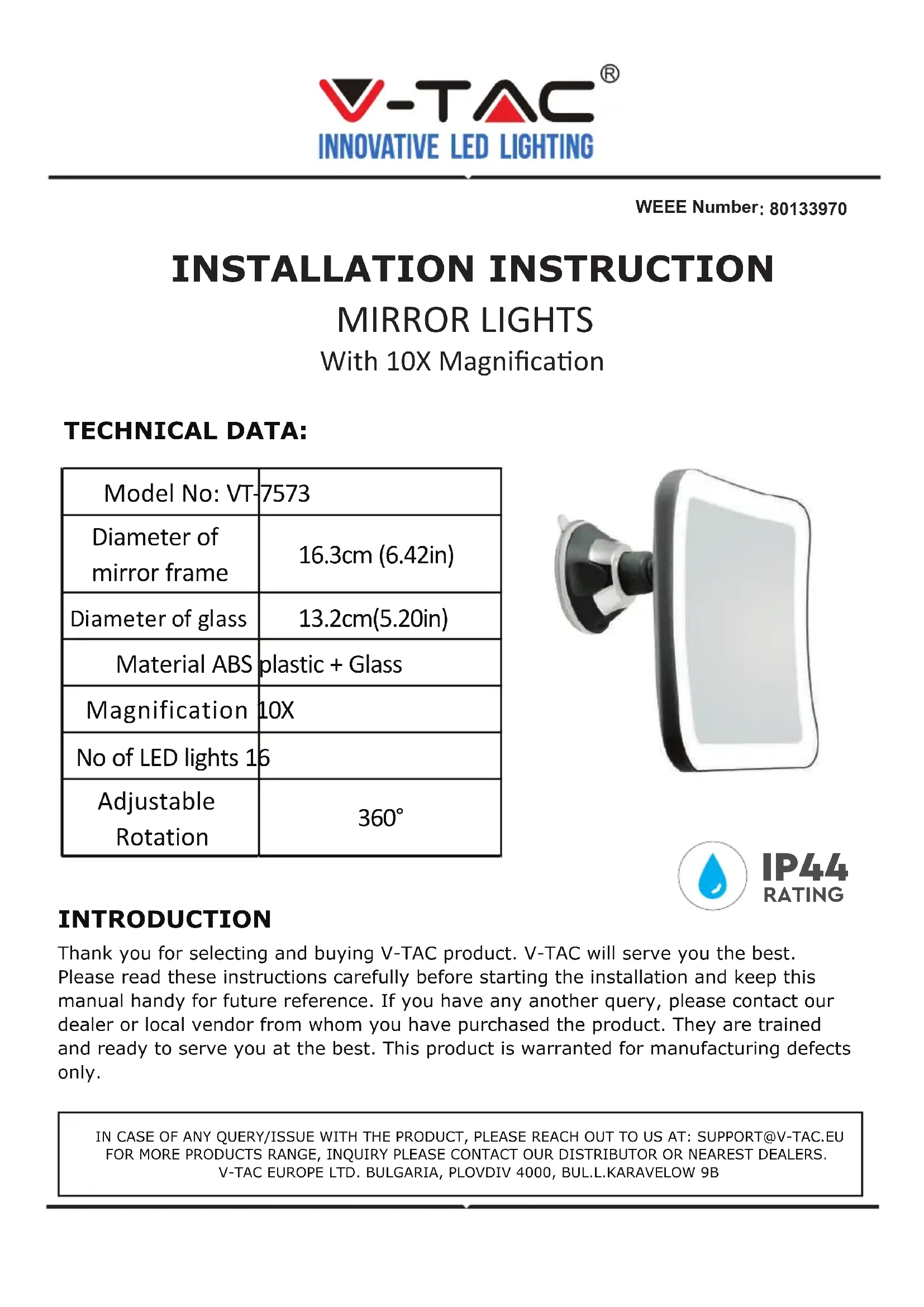 WEEE Number: 80133970 INSTALLATION INSTRUCTION MIRROR LIGHTS With 10X Magnificaon TECHNICAL DATA:IN CASE OF ANY QUERY/ISSUE WITH THE PRODUCT, PLEASE REACH OUT TO US AT: SUPPORT@V-TAC.EU FOR MORE PRODUCTS RANGE, INQUIRY PLEASE CONTACT OUR DISTRIBUTOR OR NEAREST DEALERS. V-TAC EUROPE LTD. BULGARIA, PLOVDIV 4000, BUL.L.KARAVELOW 9BINTRODUCTIONThank you for selecting and buying V-TAC product. V-TAC will serve you the best. Please read these instructions carefully before starting the installation and keep this manual handy for future reference. If you have any another query, please contact our dealer or local vendor from whom you have purchased the product. They are trained and ready to serve you at the best. This product is warranted for manufacturing defects only. IP44 RATING Model No: VT-7573 Diameter of mirror frame 16.3cm (6.42in) Diameter of glass 13.2cm(5.20in) Material ABS plastic + Glass Magnification 10X No of LED lights 16 Adjustable Rotation 360°WARNING!