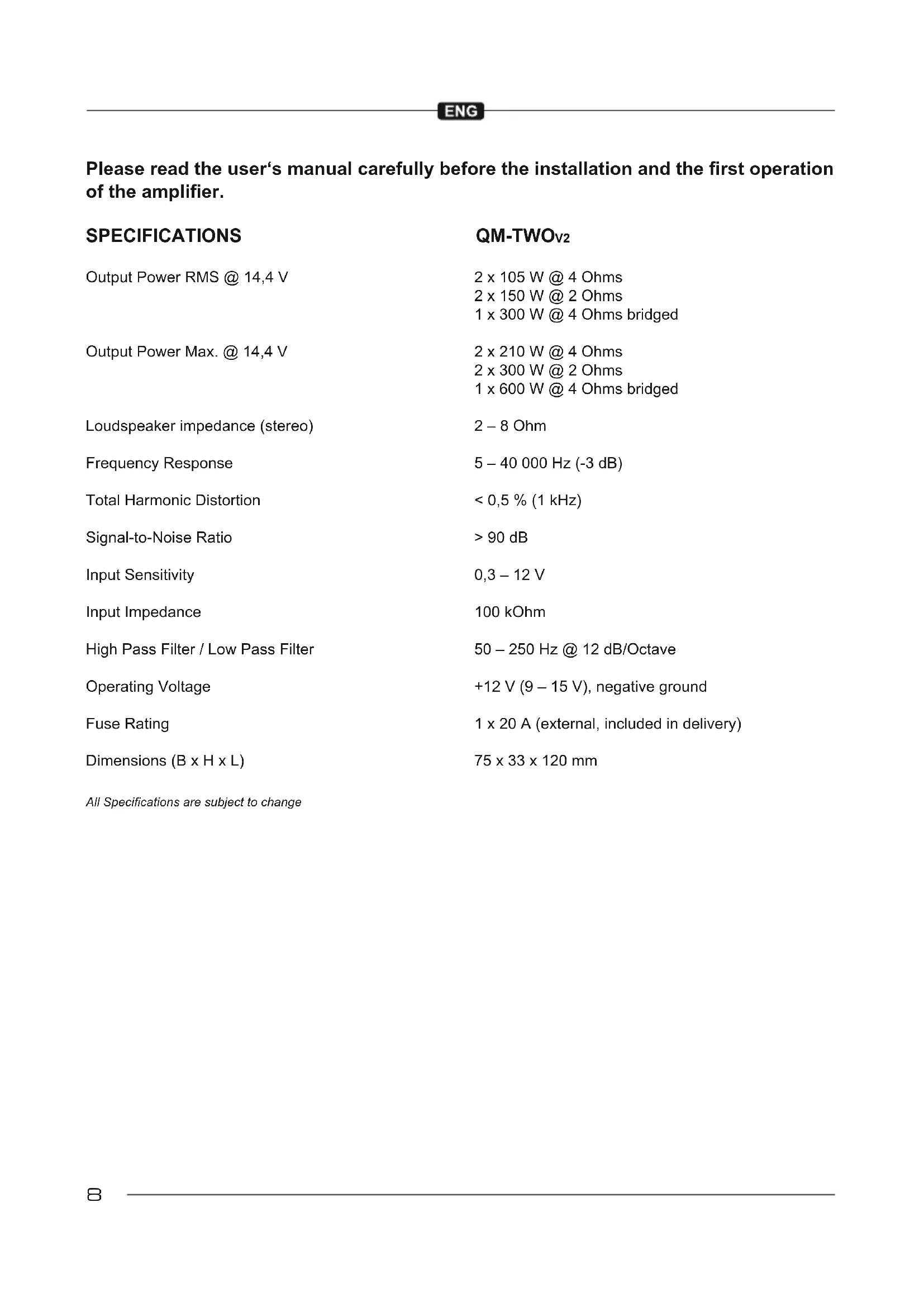 Output Power RMS @ 14,4 V Output Power Max. @ 14,4 V Loudspeaker impedance (stereo) Frequency Response Total Harmonic Distortion Signal-to-Noise Ratio Input Sensitivity Input Impedance High Pass Filter / Low Pass Filter Operating Voltage Fuse Rating Dimensions (B x H x L) 2 x 105 W @ 4 Ohms 2 x 150 W @ 2 Ohms 1 x 300 W @ 4 Ohms bridged 2 x 210 W @ 4 Ohms 2 x 300 W @ 2 Ohms 1 x 600 W @ 4 Ohms bridged 2 – 8 Ohm 5 – 40 000 Hz (-3 dB) < 0,5 % (1 kHz) > 90 dB 0,3 – 12 V 100 kOhm 50 – 250 Hz @ 12 dB/Octave +12 V (9 – 15 V), negative ground 1 x 20 A (external, included in delivery) 75 x 33 x 120 mm All Specications are subject to change9