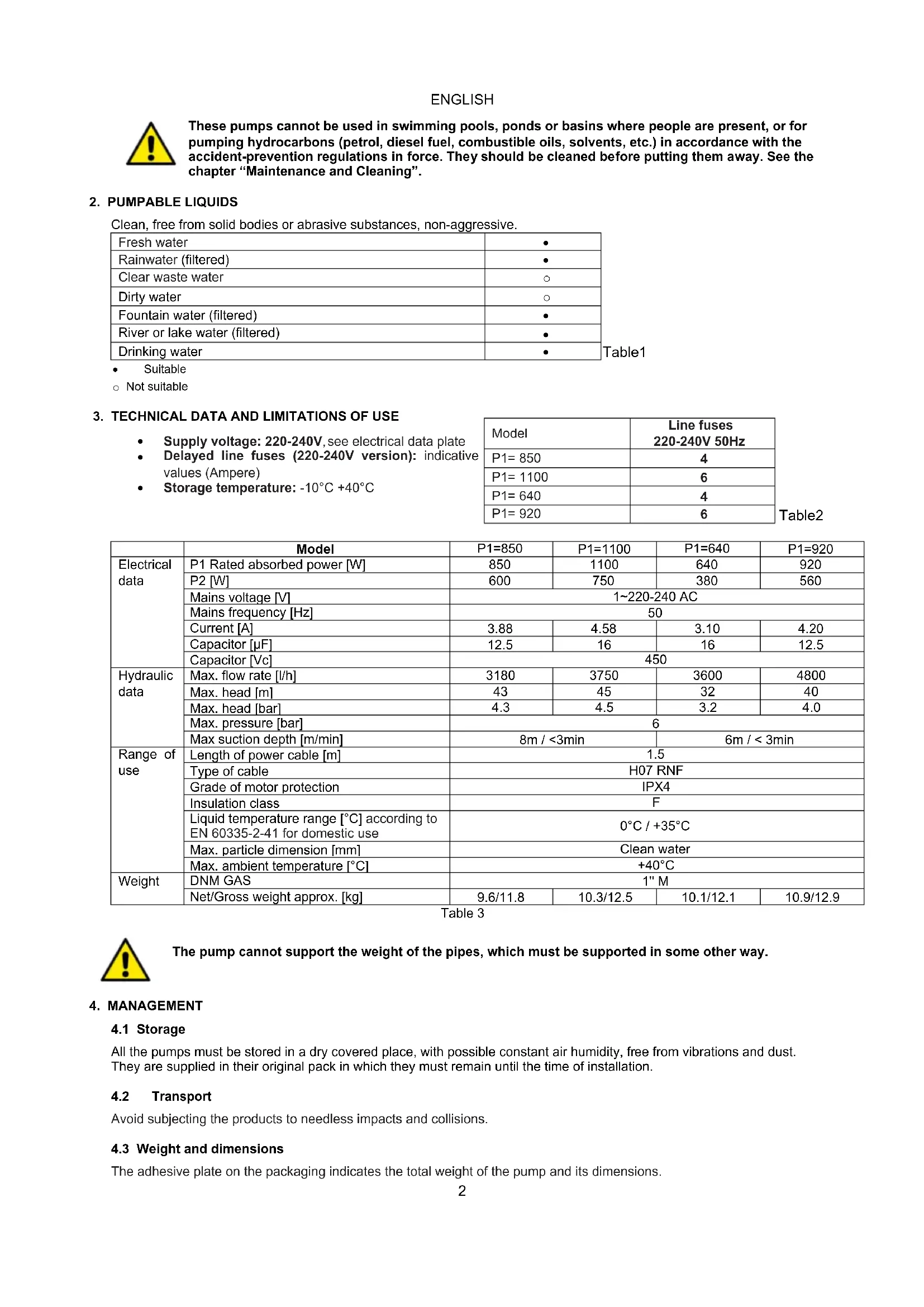 Ensure that the mains voltage is the same as the value shown on the motor plate and that there is the possibility of making a good earth connection. Follow the indications on the technical data plate and in this manual, table 3. The length of the power cable on the pump limits the installation distance, if an extension is required, make sure that it is of the same type (e.g. H05 RN-F or H07 RN-F depending on the installation) see tab.