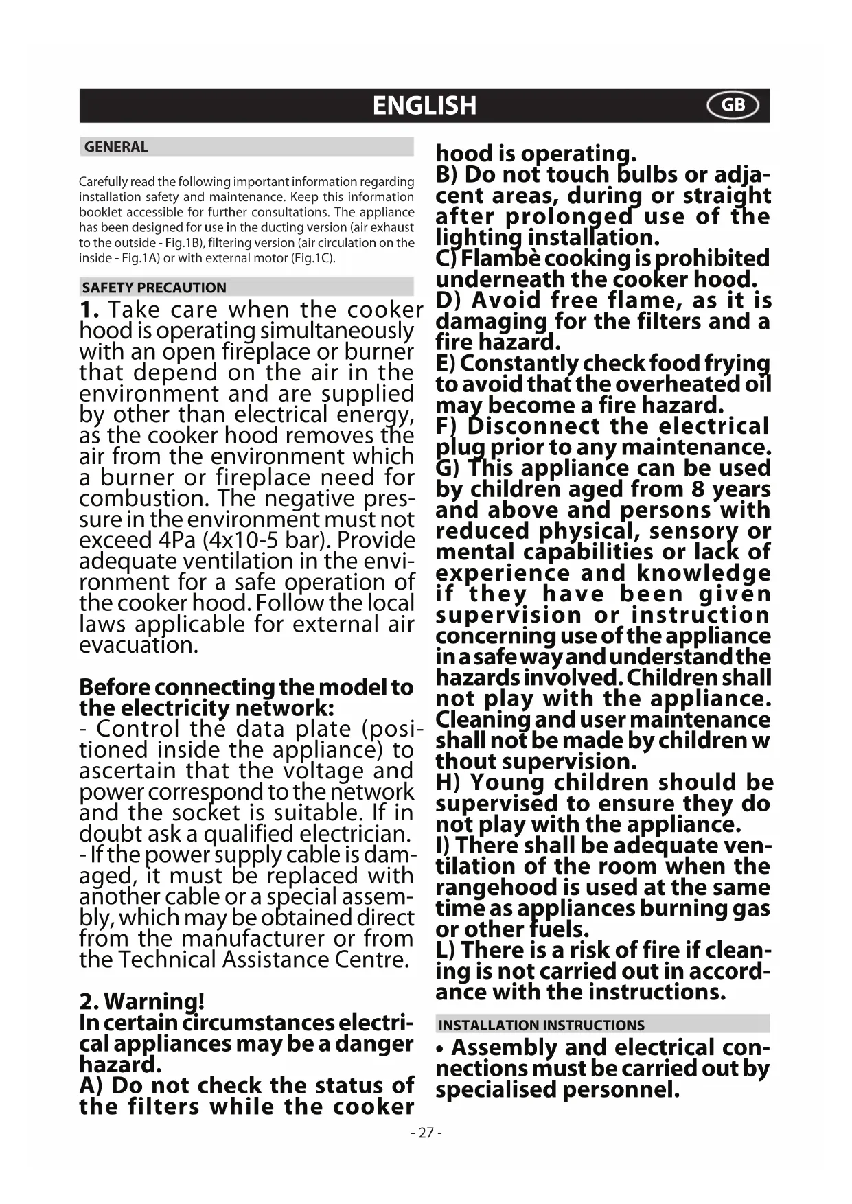 In certain circumstances electri- cal appliances may be a danger hazard. A) Do not check the status of the filters while the cooker hood is operating. B) Do not touch bulbs or adja- cent areas, during or straight after prolonged use of the lighting installation. C) Flambè cooking is prohibited underneath the cooker hood. D) Avoid free flame, as it is damaging for the filters and a fire hazard. E) Constantly check food frying to avoid that the overheated oil may become a fire hazard. F) Disconnect the electrical plug prior to any maintenance. G) This appliance can be used by children aged from 8 years and above and persons with reduced physical, sensory or mental capabilities or lack of experience and knowledge if they have been given supervision or instruction concerning use of the appliance in a safe way and understand the hazards involved. Children shall not play with the appliance. Cleaning and user maintenance shall not be made by children w thout supervision. H) Young children should be supervised to ensure they do not play with the appliance.