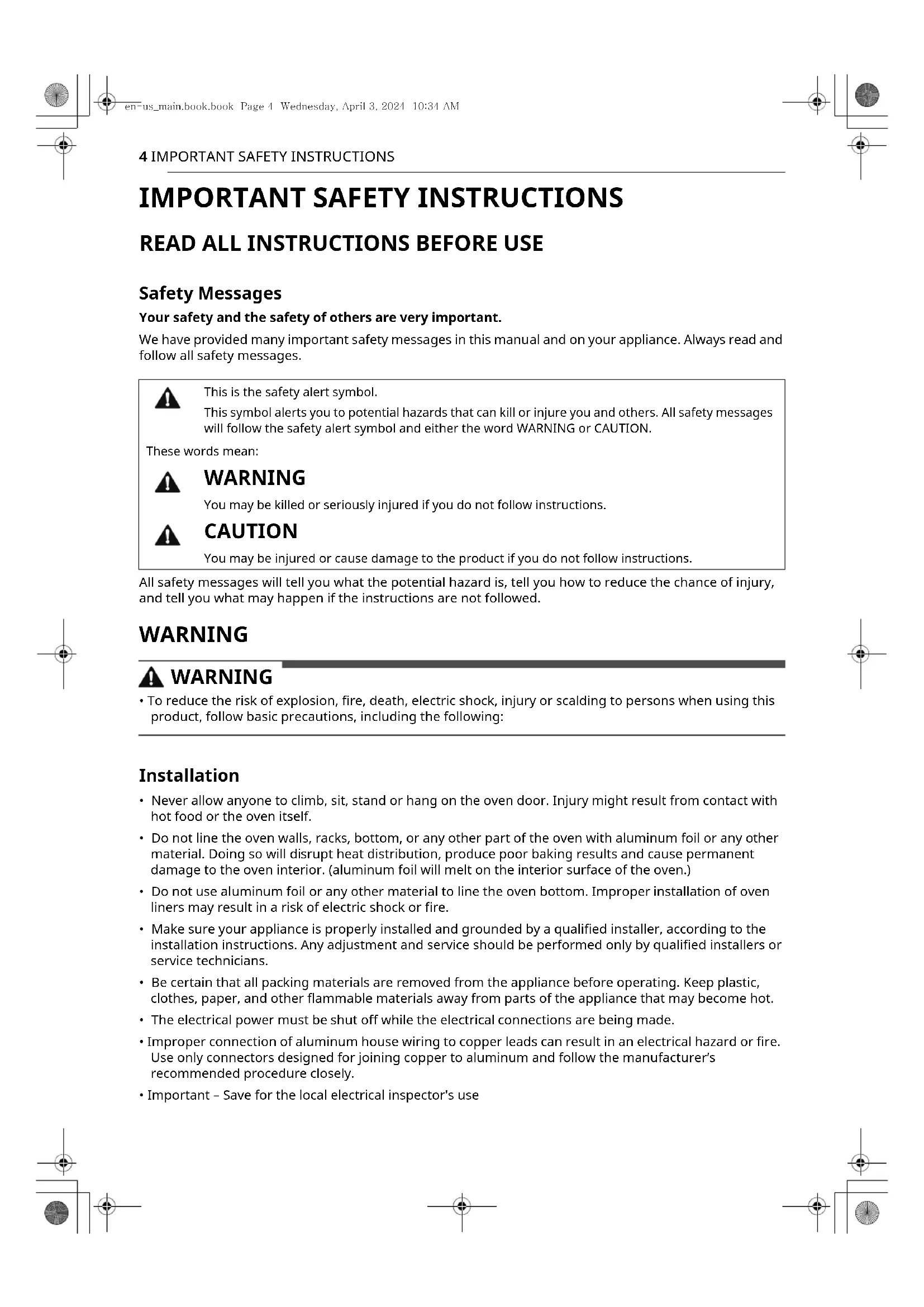 - Improper connection of aluminum house wiring to copper leads can result in an electrical hazard or fire. Use only connectors designed for joining copper to aluminum and follow the manufacturer’s recommended procedure closely.• Important – Save for the local electrical inspector's useThis is the safety alert symbol.This symbol alerts you to potential hazards that can kill or injure you and others. All safety messages will follow the safety alert symbol and either the word WARNING or CAUTION. These words mean: WARNING You may be killed or seriously injured if you do not follow instructions. CAUTION You may be injured or cause damage to the product if you do not follow instructions.en-us_main.book.book Page 4 Wednesday, April 3, 2024 10:34 AM5IMPORTANT SAFETY INSTRUCTIONS ENGLISH Operation