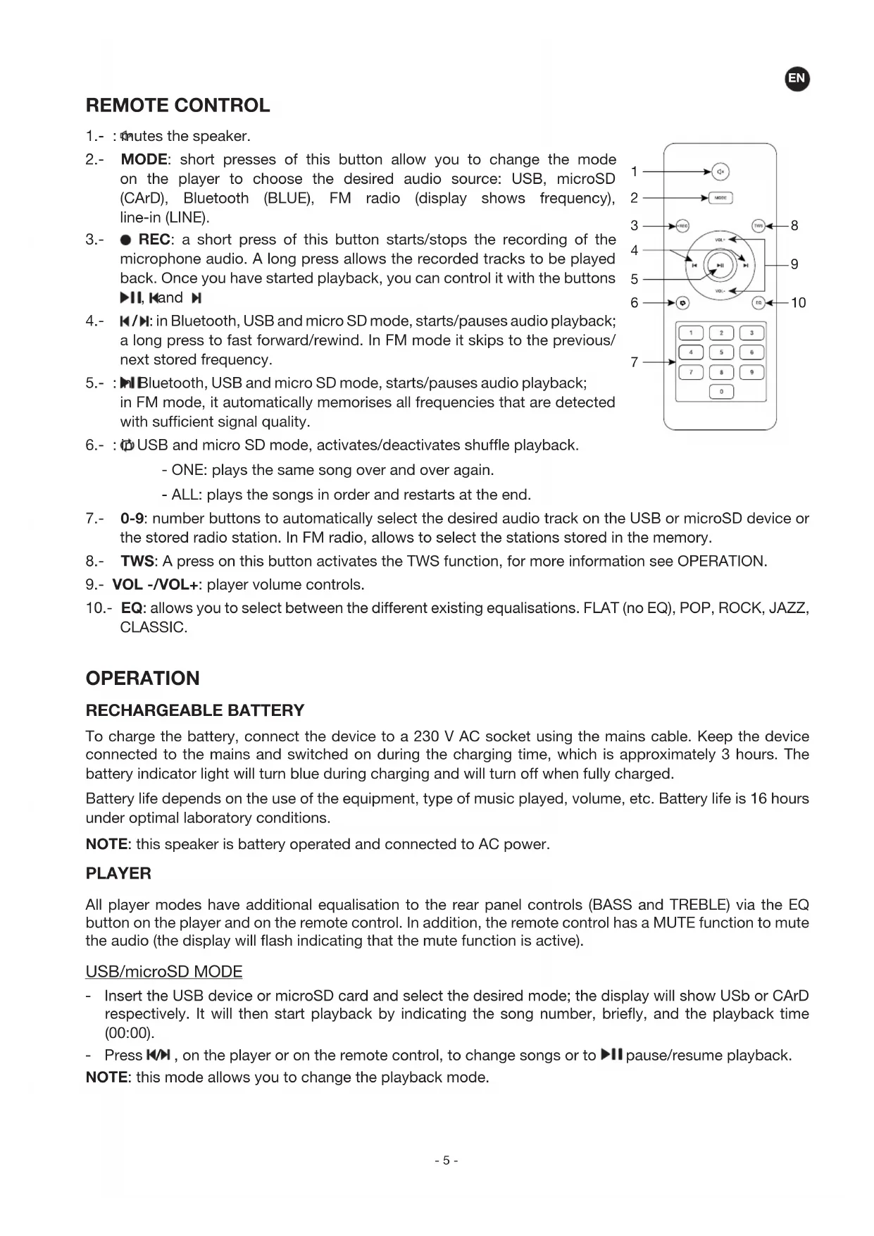 1.- : mutes the speaker. 2.- MODE: short presses of this button allow you to change the mode on the player to choose the desired audio source: USB, microSD (CArD), Bluetooth (BLUE), FM radio (display shows frequency), line-in (LINE). 3.- REC: a short press of this button starts/stops the recording of the microphone audio. A long press allows the recorded tracks to be played back. Once you have started playback, you can control it with the buttons , and . 4.- / : in Bluetooth, USB and micro SD mode, starts/pauses audio playback; a long press to fast forward/rewind. In FM mode it skips to the previous/ next stored frequency. 5.- : in Bluetooth, USB and micro SD mode, starts/pauses audio playback; in FM mode, it automatically memorises all frequencies that are detected with sufficient signal quality. 6.- : in USB and micro SD mode, activates/deactivates shuffle playback. - ONE: plays the same song over and over again. - ALL: plays the songs in order and restarts at the end. 7.- 0-9: number buttons to automatically select the desired audio track on the USB or microSD device or the stored radio station. In FM radio, allows to select the stations stored in the memory. 8.- TWS: A press on this button activates the TWS function, for more information see OPERATION. 9.- VOL -/VOL+: player volume controls. 10.- EQ: allows you to select between the different existing equalisations. FLAT (no EQ), POP, ROCK, JAZZ, CLASSIC. OPERATION RECHARGEABLE BATTERY To charge the battery, connect the device to a 230 V AC socket using the mains cable. Keep the device connected to the mains and switched on during the charging time, which is approximately 3 hours. The battery indicator light will turn blue during charging and will turn off when fully charged. Battery life depends on the use of the equipment, type of music played, volume, etc. Battery life is 16 hours under optimal laboratory conditions. NOTE: this speaker is battery operated and connected to AC power. PLAYER All player modes have additional equalisation to the rear panel controls (BASS and TREBLE) via the EQ button on the player and on the remote control. In addition, the remote control has a MUTE function to mute the audio (the display will flash indicating that the mute function is active). USB/microSD MODE - Insert the USB device or microSD card and select the desired mode; the display will show USb or CArD respectively. It will then start playback by indicating the song number, briefly, and the playback time (00:00). - Press / , on the player or on the remote control, to change songs or to pause/resume playback. NOTE: this mode allows you to change the playback mode.EN