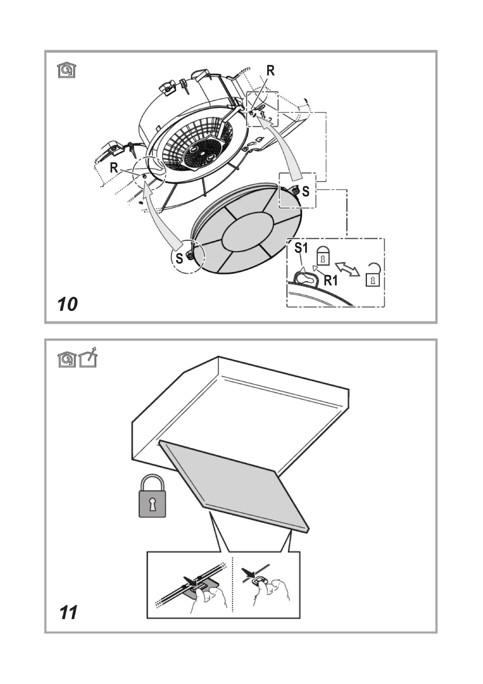 Maintenance of the charcoal filter It absorbs unpleasant odors caused by cooking. The saturation of the charcoal filter occurs after more or less prolonged use, depending on the type of cooking and the regularity of cleaning of the grease filter. In any case it is necessary to replace the cartridge at least every four months. The charcoal filter may NOT be washed or regenerated. Remove the grease filters. Fit the charcoalfilters over the motor. Align the pins R on the cowl with the slots S, then turn the filter clockwise until it locks in place. Reverse the above procedure to remove the charcoal filters. Refit the grease filters.