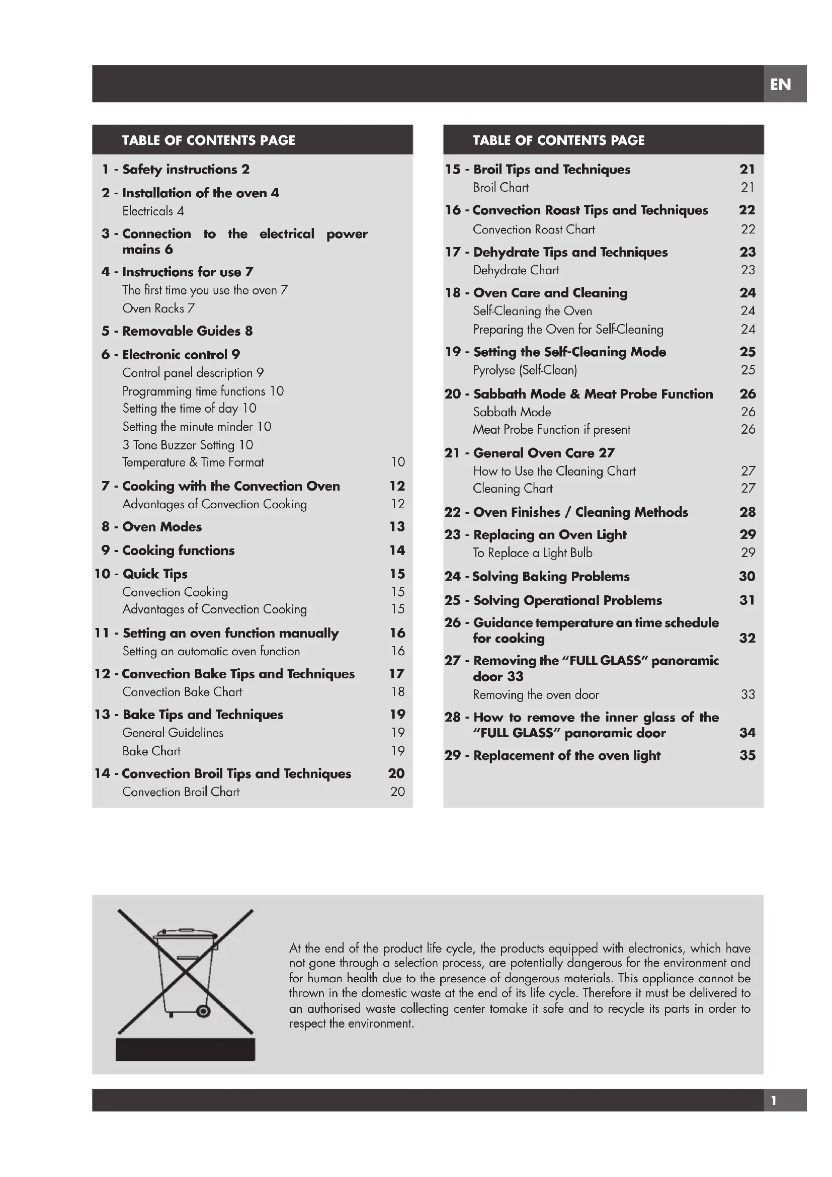 At the end of the product life cycle, the products equipped with electronics, which have not gone through a selection process, are potentially dangerous for the environment and for human health due to the presence of dangerous materials. This appliance cannot be thrown in the domestic waste at the end of its life cycle. Therefore it must be delivered to an authorised waste collecting center tomake it safe and to recycle its parts in order to respect the environment.EN
