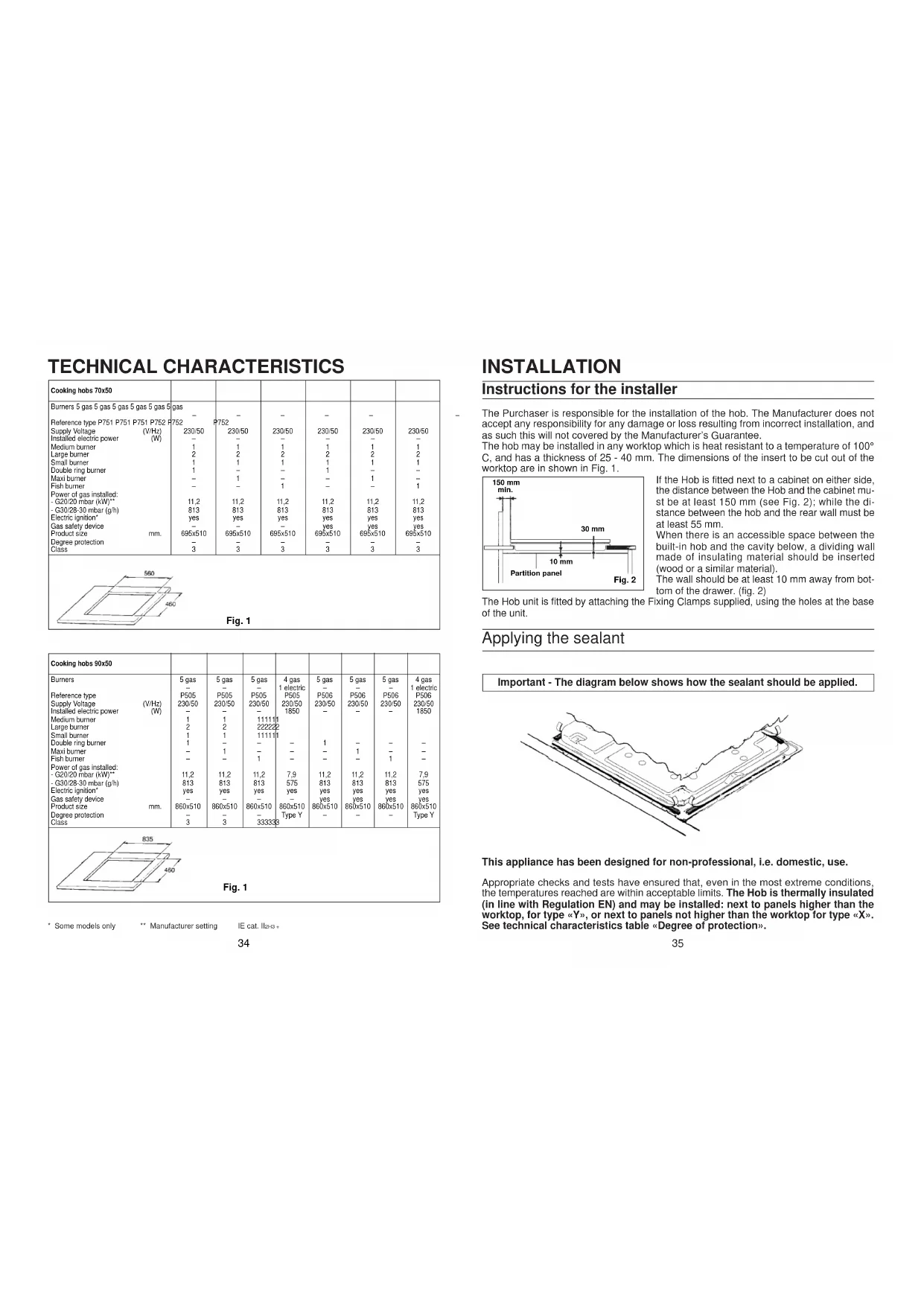 ES35 INSTALLATION Instructions for the installer The Purchaser is responsible for the installation of the hob. The Manufacturer does notaccept any responsibility for any damage or loss resulting from incorrect installation, andas such this will not covered by the Manufacturer’s Guarantee.The hob may be installed in any worktop which is heat resistant to a temperature of 100°C, and has a thickness of 25 - 40 mm. The dimensions of the insert to be cut out of theworktop are in shown in Fig. 1.If the Hob is fitted next to a cabinet on either side,the distance between the Hob and the cabinet mu-st be at least 150 mm (see Fig. 2); while the di-stance between the hob and the rear wall must beat least 55 mm. When there is an accessible space between thebuilt-in hob and the cavity below, a dividing wallmade of insulating material should be inserted(wood or a similar material).The wall should be at least 10 mm away from bot-tom of the drawer. (fig. 2)The Hob unit is fitted by attaching the Fixing Clamps supplied, using the holes at the baseof the unit. Applying the sealant Important - The diagram below shows how the sealant should be applied. This appliance has been designed for non-professional, i.e. domestic, use. Appropriate checks and tests have ensured that, even in the most extreme conditions, the temperatures reached are within acceptable limits. The Hob is thermally insulated (in line with Regulation EN) and may be installed: next to panels higher than the worktop, for type «Y», or next to panels not higher than the worktop for type «X». See technical characteristics table «Degree of protection». Fig. 2Partition panel150 mm min. 30 mm10 mm