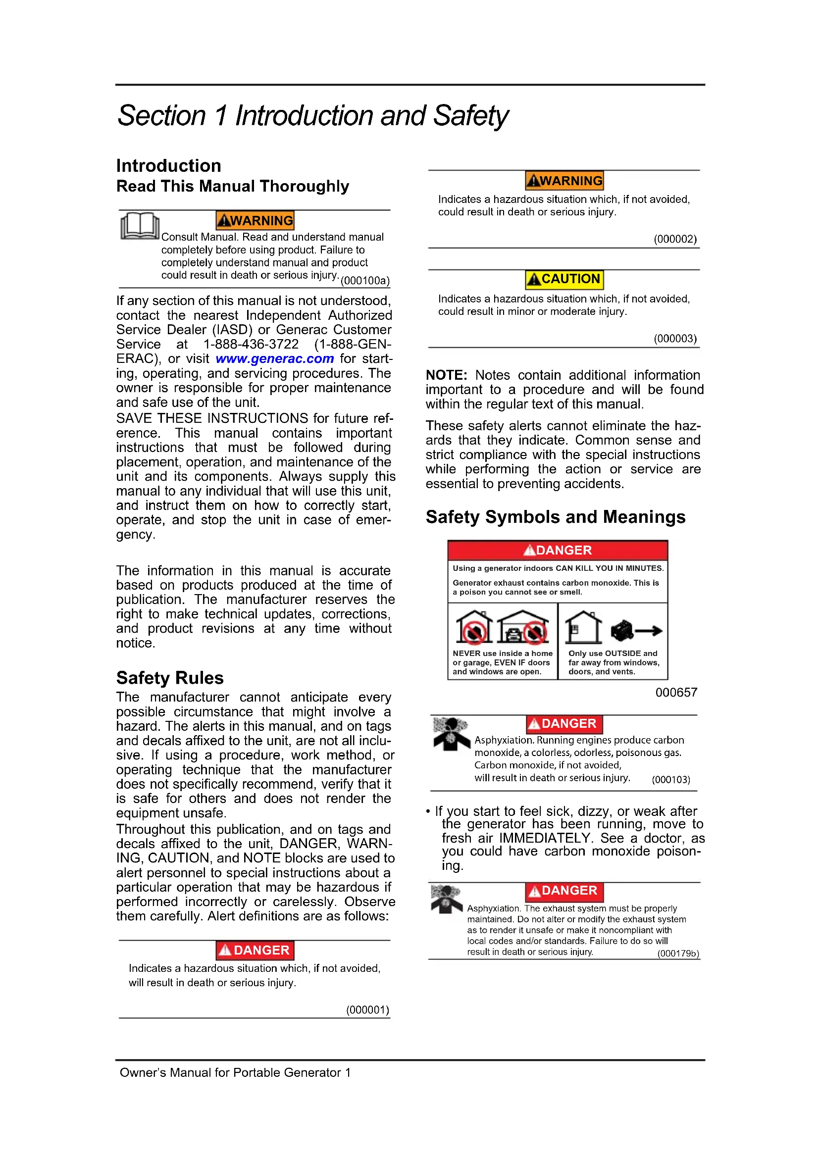 If any section of this manual is not understood, contact the nearest Independent Authorized Service Dealer (IASD) or Generac Customer Service at 1-888-436-3722 (1-888-GENERAC), or visit wwwgenerac.com for starting, operating, and servicing procedures. The owner is responsible for proper maintenance and safe use of the unit.