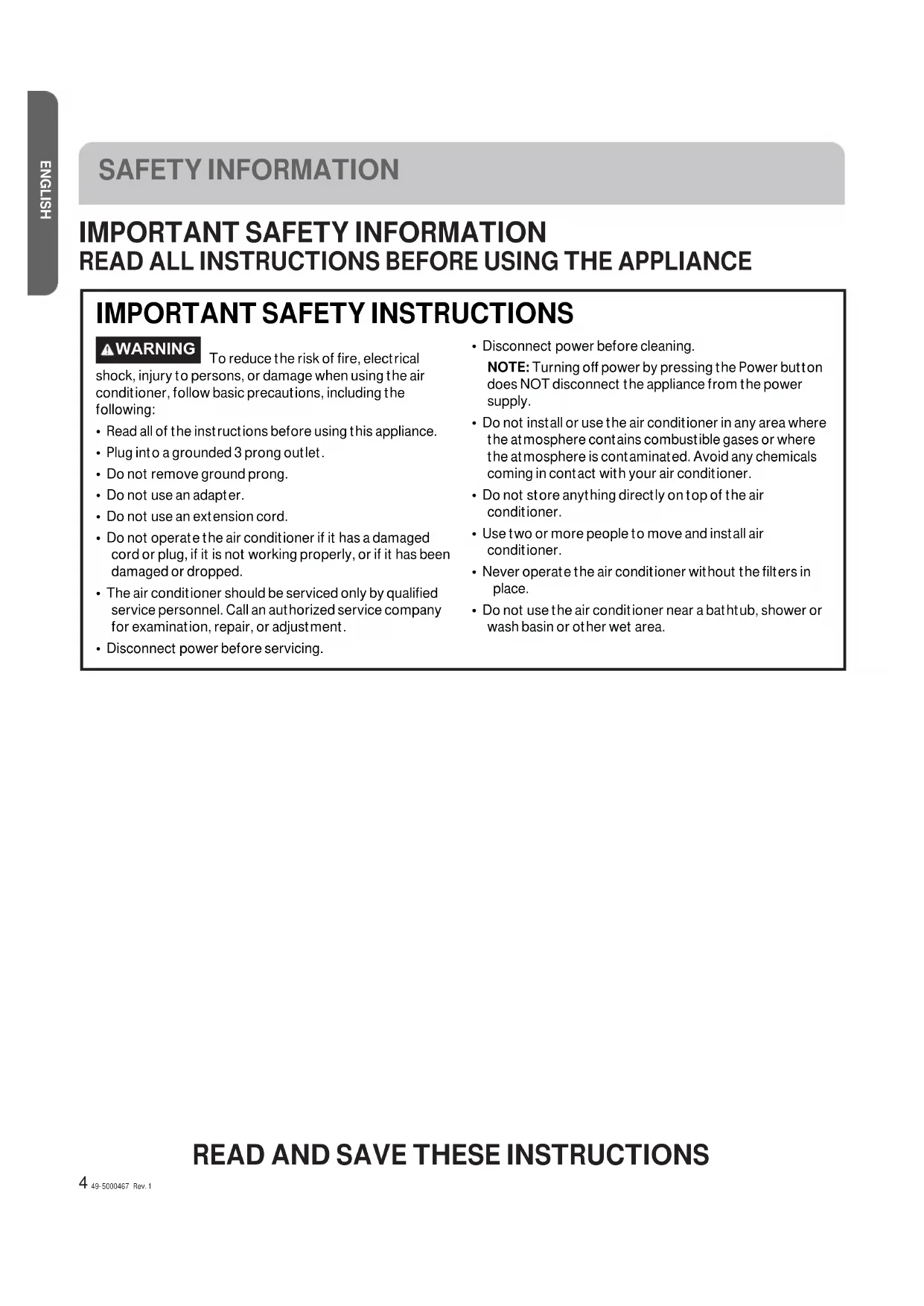 READ ALL INSTRUCTIONS BEFORE USING THE APPLIANCE49-5000467 Rev. 1 5 ENGLISH Features and appearance will vary. Lights next to the touch pads on the air conditioner control panel indicate the selected settings. A. Control Panel Display Displays the Set Temperature in degrees Fahrenheit or degrees Celsius, or the hours remaining in a Time Delay. The corresponding indicator light will illuminate. B. Power Button Turns ON/OFF power to the air conditioner. NOTE: Turning off power by pressing the Power button does NOT disconnect the appliance from the power supply.