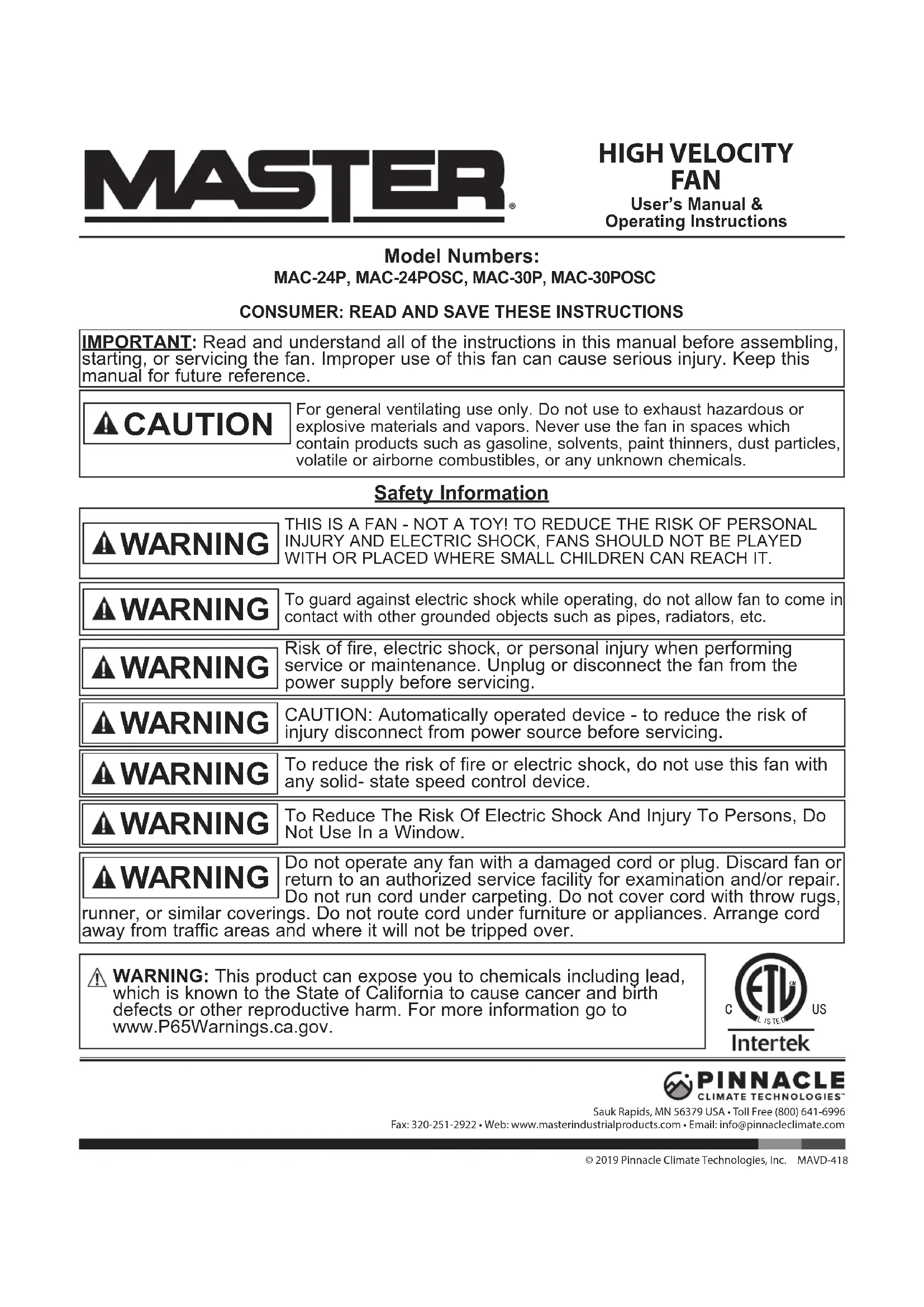 which is known to the State of California to cause cancer and birth defects or other reproductive harm. For more information go to www.P65Warnings.ca.gov.NEVER LEAVE A FAN UNATTENDED WHILE OPERATING OR WHILE CONNECTED TO A POWER SOURCE © 2019, Pinnacle Climate Technologies, Inc. High Velocity Fan User’s Manual