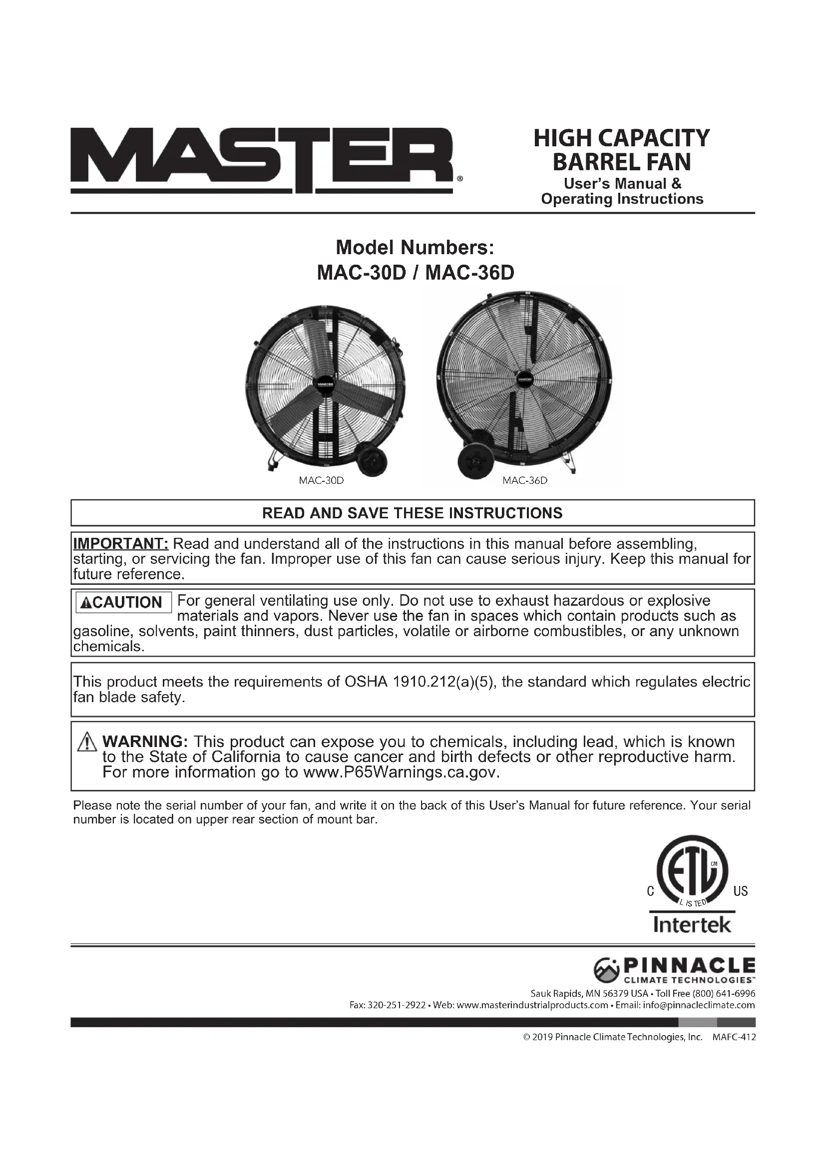 Tighten Motor Safeguard bolts and 4 motor bolts. NOTE: Installation work and electrical wiring must be done by qualied person(s) in accordance with all applicable codes and regulations.© 2019, Pinnacle Climate Technologies, Inc. 6 High Capacity Barrel Fan User’s Manual NEVER LEAVE A FAN UNATTENDED WHILE OPERATING OR WHILE CONNECTED TO A POWER SOURCE Pinnacle Climate Technologies. Inc. reserves the right to make any changes in materials, specifications, prices or design without notice. Pinnacle Climate Technologies, Inc. may also discontinue items at any time. MAC-30D Exploded View MAC-36D© 2019, Pinnacle Climate Technologies, Inc. 7 High Capacity Barrel Fan User’s Manual NEVER LEAVE A FAN UNATTENDED WHILE OPERATING OR WHILE CONNECTED TO A POWER SOURCE ALWAYS BE SURE TO SPECIFY MODEL NUMBER AND SERIAL NUMBER WHEN MAKING ANY CLAIM WITH PINNACLE CLIMATE TECHNOLOGIES, INC. FOR YOUR CONVENIENCE USE THE SPACE PRO- VIDED BELOW TO LIST THIS INFORMATION: Model #: ____________________ Serial #: ______________________ Date of Purchase: _________________