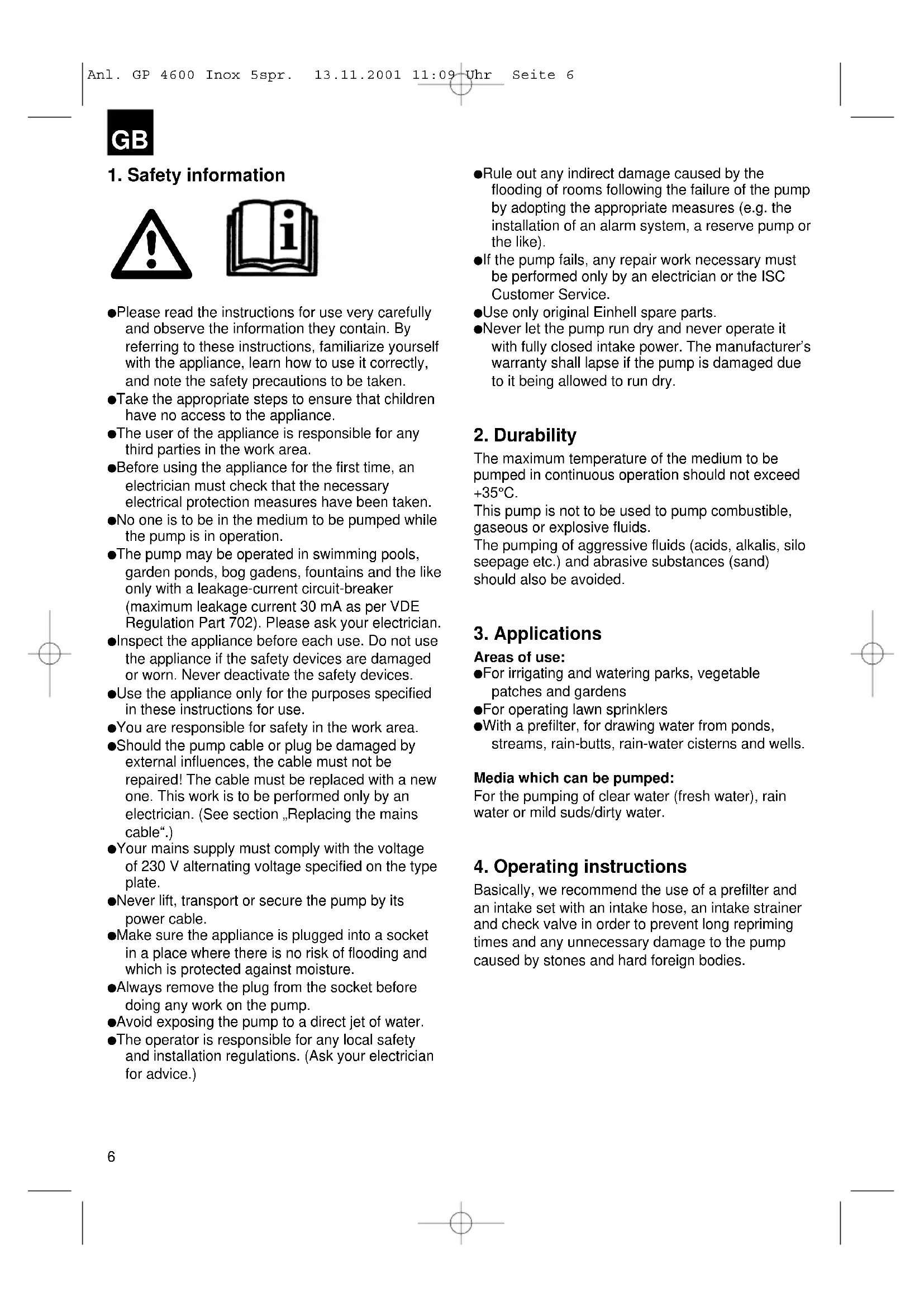 Anl. GP 4600 Inox 5spr. 13.11.2001 11:09 Uhr Seite 66. Electrical connections Connect the power cable to a 230 V 50 Hz earthed, 10 amp fuse minimum. The appliance is switched on and off using the integrated ON/OFF switch. The pilot lamp inside the switch lights up when the motor is switched on. The motor is protected against overloading or blocking by an integrated thermostat. In the event of overheating, the thermostat switches off the pump automatically. The pump will start up again automatically after it has cooled down.