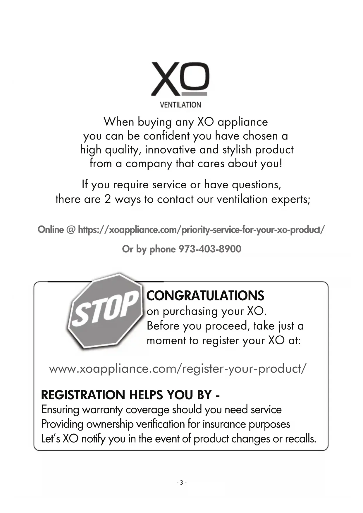 When buying any XO appliance you can be confident you have chosen a high quality, innovative and stylish product from a company that cares about you! If you require service or have questions, there are 2 ways to contact our ventilation experts; Online @ https://xoappliance.com/priority-service-for-your-xo-product/ Or by phone 973-403-8900 CONGRATULATIONS on purchasing your XO. Before you proceed, take just a moment to register your XO at: www.xoappliance.com/register-your-product/