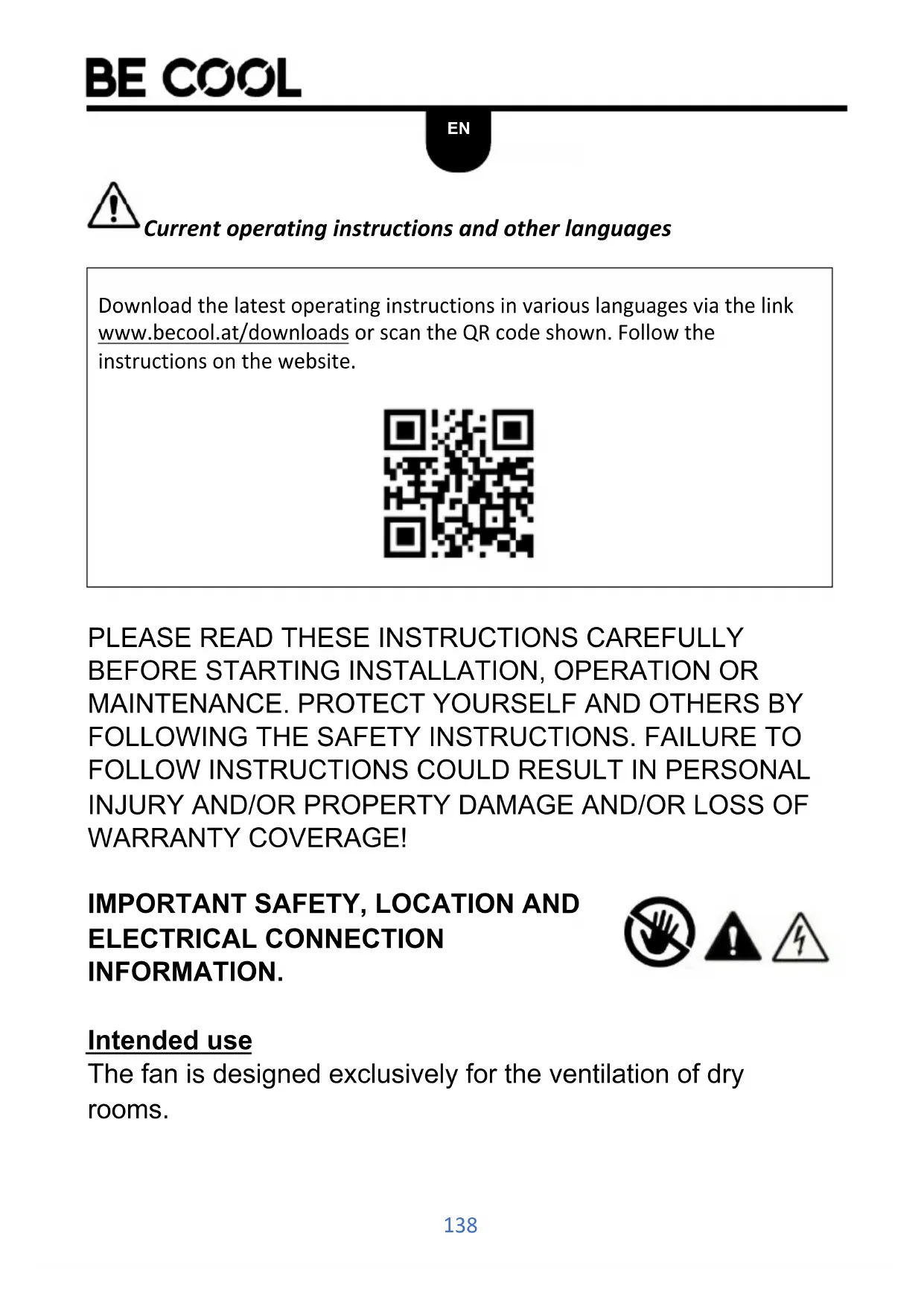 Download the latest operating instructions in various languages via the link www.becool.at/downloads or scan the QR code shown. Follow the instructions on the website.