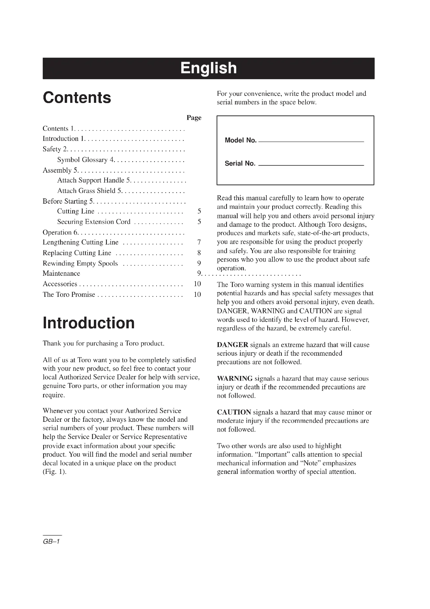 19GB–1 Contents Page Contents 1... Introduction 1... Safety 2... Symbol Glossary 4... Assembly 5... Attach Support Handle 5... Attach Grass Shield 5... Before Starting 5... Cutting Line 5... Securing Extension Cord 5... Operation 6... Lengthening Cutting Line 7... Replacing Cutting Line 8... Rewinding Empty Spools 9... Maintenance 9... Accessories 10... The Toro Promise 10... Introduction Thank you for purchasing a Toro product. All of us at Toro want you to be completely satisfied with your new product, so feel free to contact your local Authorized Service Dealer for help with service, genuine Toro parts, or other information you may require. Whenever you contact your Authorized Service Dealer or the factory, always know the model and serial numbers of your product. These numbers will help the Service Dealer or Service Representative provide exact information about your specific product. You will find the model and serial number decal located in a unique place on the product (Fig. 1). For your convenience, write the product model and serial numbers in the space below. Model No. Serial No. Read this manual carefully to learn how to operate and maintain your product correctly. Reading this manual will help you and others avoid personal injury and damage to the product. Although Toro designs, produces and markets safe, state-of-the-art products, you are responsible for using the product properly and safely. You are also responsible for training persons who you allow to use the product about safe operation. The Toro warning system in this manual identifies potential hazards and has special safety messages that help you and others avoid personal injury, even death. DANGER, WARNING and CAUTION are signal words used to identify the level of hazard. However, regardless of the hazard, be extremely careful. DANGER signals an extreme hazard that will cause serious injury or death if the recommended precautions are not followed. WARNING signals a hazard that may cause serious injury or death if the recommended precautions are not followed. CAUTION signals a hazard that may cause minor or moderate injury if the recommended precautions are not followed. Two other words are also used to highlight information. “Important” calls attention to special mechanical information and “Note” emphasizes general information worthy of special attention.GB–2 Safety IMPORTANT SAFETY INSTRUCTIONS To assure maximum safety, best performance, and to gain knowledge of the appliance, it is essential that you or any other operator of the appliance read and understand the contents of this manual before operating the appliance. Pay particular attention to the safety alert symbol which means CAUTION, WARNING OR DANGER — “personal safety instruction.” Read and understand the instruction because it has to do with safety. FAILURE TO COMPLY WITH