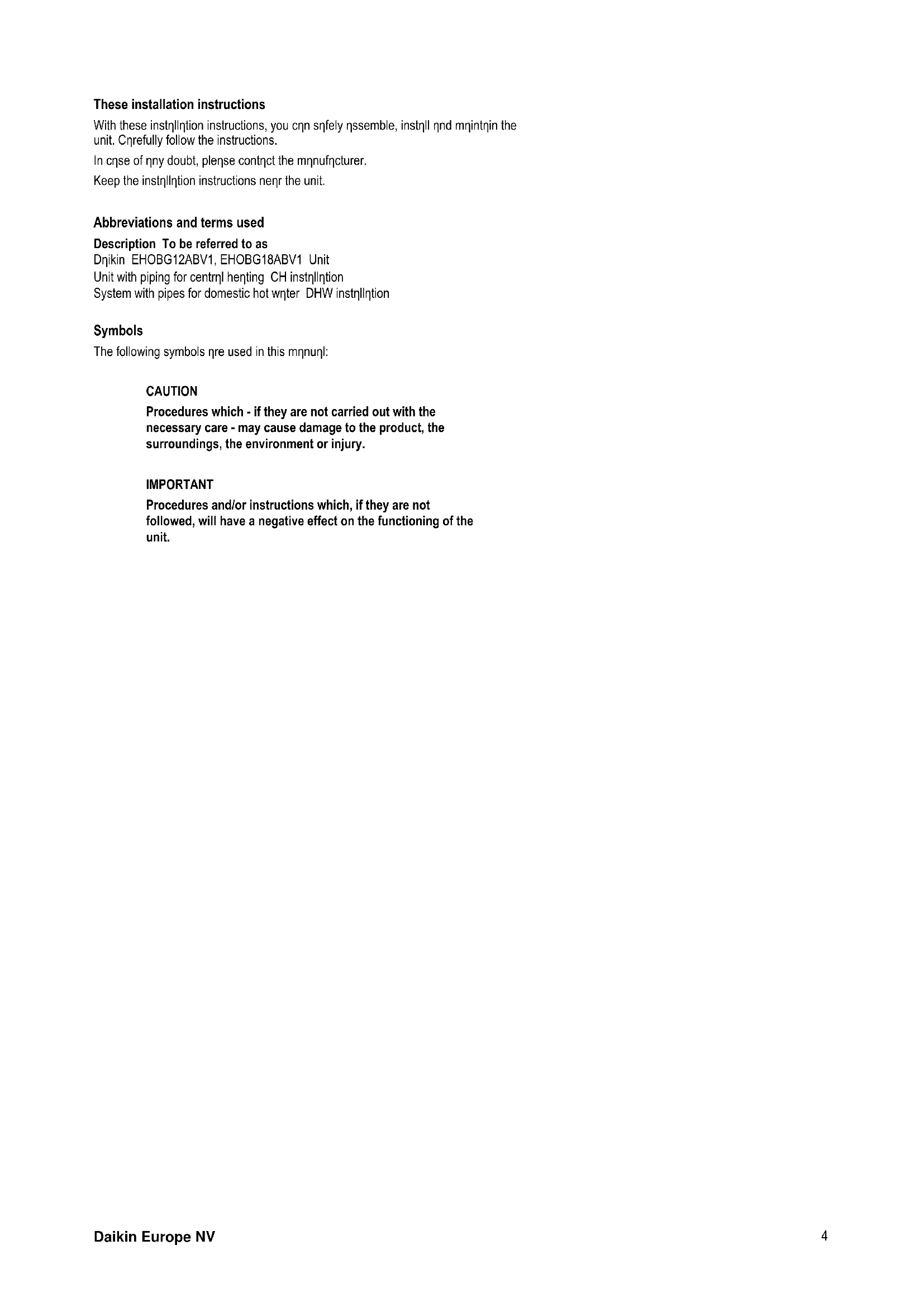 These installation instructions With these installation instructions, you can safely assemble, install and maintain the unit. Carefully follow the instructions. In case of any doubt, please contact the manufacturer. Keep the installation instructions near the unit. Abbreviations and terms used Description To be referred to as Daikin EHOBG12ABV1, EHOBG18ABV1 Unit Unit with piping for central heating CH installation System with pipes for domestic hot water DHW installation Symbols The following symbols are used in this manual: