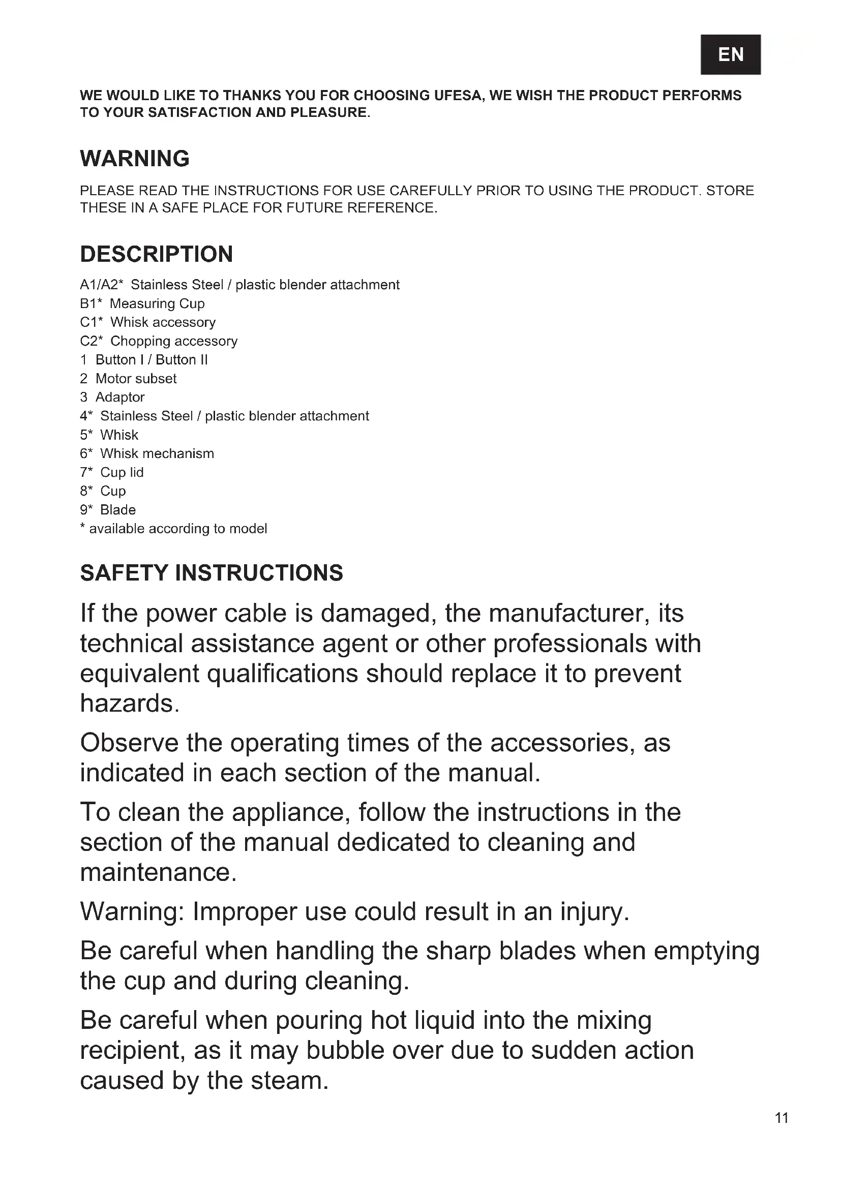 WE WOULD LIKE TO THANKS YOU FOR CHOOSING UFESA, WE WISH THE PRODUCT PERFORMS TO YOUR SATISFACTION AND PLEASURE. WARNING PLEASE READ THE INSTRUCTIONS FOR USE CAREFULLY PRIOR TO USING THE PRODUCT. STORE THESE IN A SAFE PLACE FOR FUTURE REFERENCE. DESCRIPTION A1/A2* Stainless Steel / plastic blender attachment B1* Measuring Cup C1* Whisk accessory C2* Chopping accessory 1 Button I / Button II 2 Motor subset 3 Adaptor 4* Stainless Steel / plastic blender attachment 5* Whisk 6* Whisk mechanism 7* Cup lid 8* Cup 9* Blade