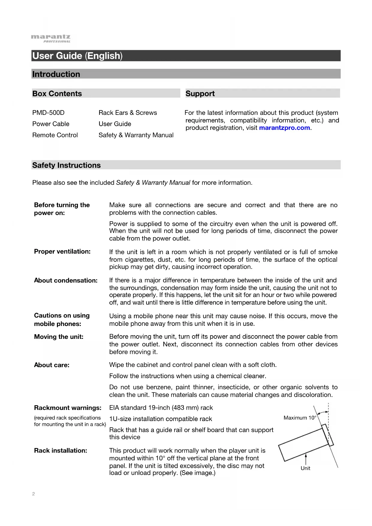 Support PMD-500D Power Cable Remote Control Rack Ears & Screws User Guide Safety & Warranty Manual For the latest information about this product (system requirements, compatibility information, etc.) and product registration, visit marantzpro.com. Safety Instructions Please also see the included Safety & Warranty Manual for more information. Before turning the power on: Make sure all connections are secure and correct and that there are no problems with the connection cables. Power is supplied to some of the circuitry even when the unit is powered off. When the unit will not be used for long periods of time, disconnect the power cable from the power outlet. Proper ventilation: If the unit is left in a room which is not properly ventilated or is full of smoke from cigarettes, dust, etc. for long periods of time, the surface of the optical pickup may get dirty, causing incorrect operation.