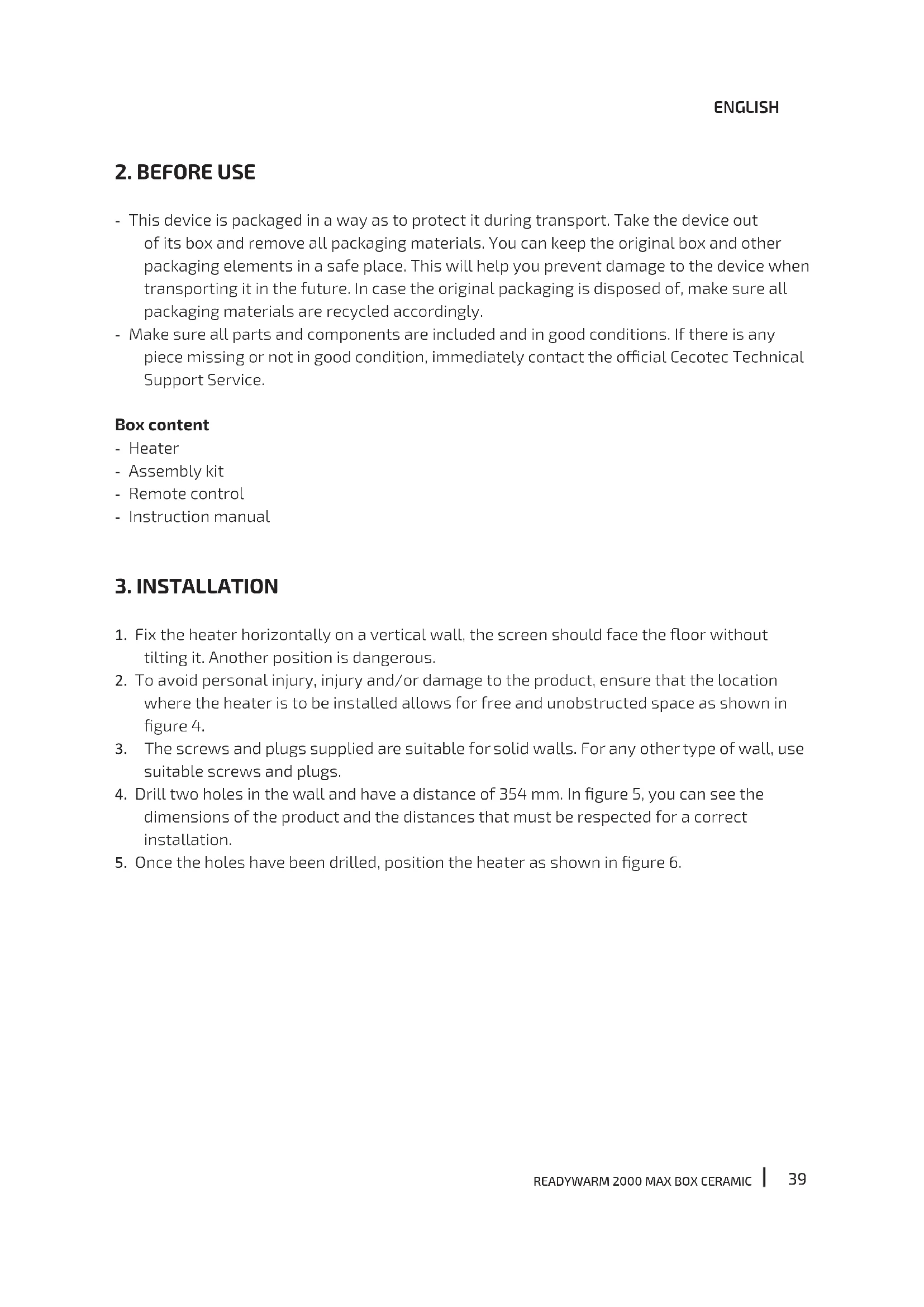 - This device is packaged in a way as to protect it during transport. Take the device out of its box and remove all packaging materials. You can keep the original box and other packaging elements in a safe place. This will help you prevent damage to the device when transporting it in the future. In case the original packaging is disposed of, make sure all packaging materials are recycled accordingly. - Make sure all parts and components are included and in good conditions. If there is any piece missing or not in good condition, immediately contact the ocial Cecotec Technical Support Service. Box content - Heater - Assembly kit - Remote control - Instruction manual