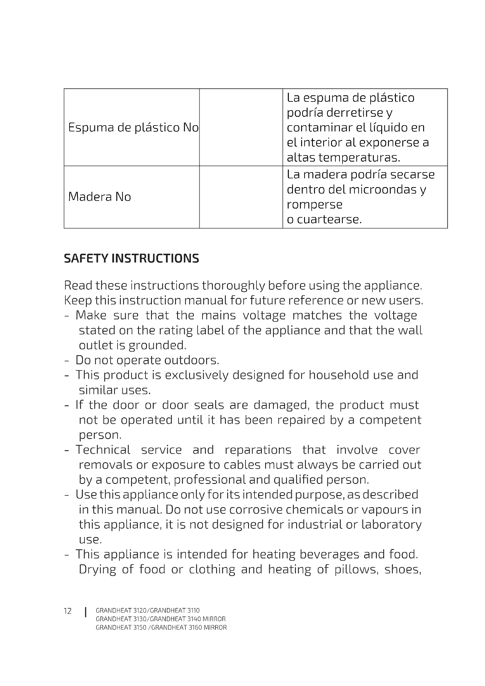 Espuma de plástico No La espuma de plástico podría derretirse y contaminar el líquido en el interior al exponerse a altas temperaturas. Madera No La madera podría secarse dentro del microondas y romperse o cuartearse. SAFETY INSTRUCTIONS Read these instructions thoroughly before using the appliance. Keep this instruction manual for future reference or new users. - Make sure that the mains voltage matches the voltage stated on the rating label of the appliance and that the wall outlet is grounded. - Do not operate outdoors. - This product is exclusively designed for household use and similar uses. - If the door or door seals are damaged, the product must not be operated until it has been repaired by a competent person. - Technical service and reparations that involve cover removals or exposure to cables must always be carried out by a competent, professional and qualied person. - Use this appliance only for its intended purpose, as described in this manual. Do not use corrosive chemicals or vapours in this appliance, it is not designed for industrial or laboratory use. - This appliance is intended for heating beverages and food. Drying of food or clothing and heating of pillows, shoes,GRANDHEAT 3120/GRANDHEAT 3110