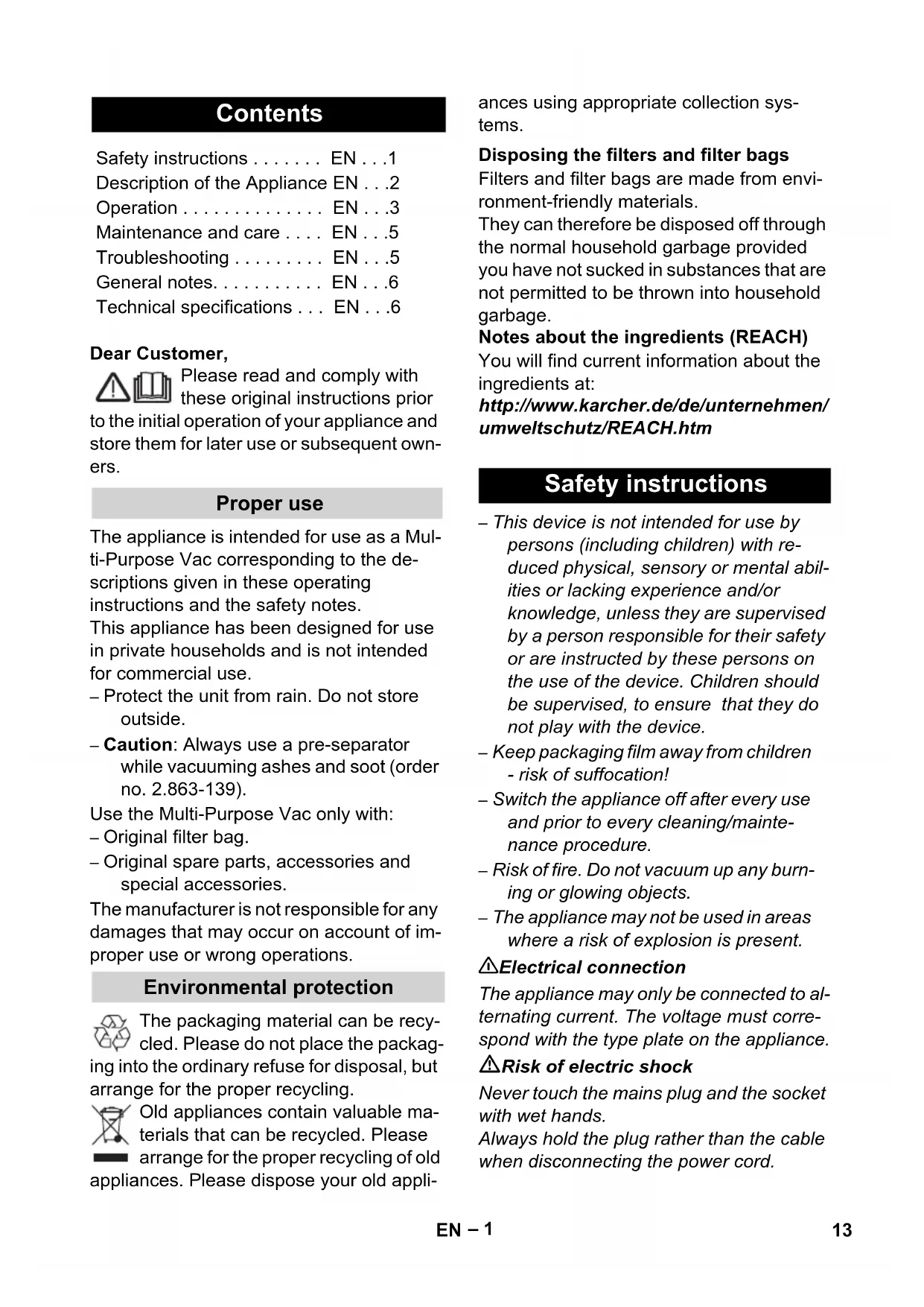 - Netzkabel Schalldruckpegel (EN 60704-2-1) Gewicht (ohne Zubehör) 12 DE– 1 Dear Customer, Please read and comply with these original instructions prior to the initial operation of your appliance and store them for later use or subsequent own- ers. The appliance is intended for use as a Mul- ti-Purpose Vac corresponding to the de- scriptions given in these operating instructions and the safety notes. This appliance has been designed for use in private households and is not intended for commercial use. – Protect the unit from rain. Do not store outside. – Caution: Always use a pre-separator while vacuuming ashes and soot (order no. 2.863-139). Use the Multi-Purpose Vac only with: – Original filter bag. – Original spare parts, accessories and special accessories. The manufacturer is not responsible for any damages that may occur on account of im- proper use or wrong operations. The packaging material can be recy- cled. Please do not place the packag- ing into the ordinary refuse for disposal, but arrange for the proper recycling. Old appliances contain valuable ma- terials that can be recycled. Please arrange for the proper recycling of old appliances. Please dispose your old appli- ances using appropriate collection sys- tems. Filters and filter bags are made from envi- ronment-friendly materials. They can therefore be disposed off through the normal household garbage provided you have not sucked in substances that are not permitted to be thrown into household garbage. Notes about the ingredients (REACH) You will find current information about the ingredients at: http://www.karcher.de/de/unternehmen/ umweltschutz/REACH.htm – This device is not intended for use by persons (including children) with re- duced physical, sensory or mental abil- ities or lacking experience and/or knowledge, unless they are supervised by a person responsible for their safety or are instructed by these persons on the use of the device. Children should be supervised, to ensure that they do not play with the device. – Keep packaging film away from children - risk of suffocation! – Switch the appliance off after every use and prior to every cleaning/mainte- nance procedure. – Risk of fire. Do not vacuum up any burn- ing or glowing objects. – The appliance may not be used in areas where a risk of explosion is present. 몇 Electrical connection The appliance may only be connected to al- ternating current. The voltage must corre- spond with the type plate on the appliance. Risk of electric shock Never touch the mains plug and the socket with wet hands. Always hold the plug rather than the cable when disconnecting the power cord. Contents Safety instructions