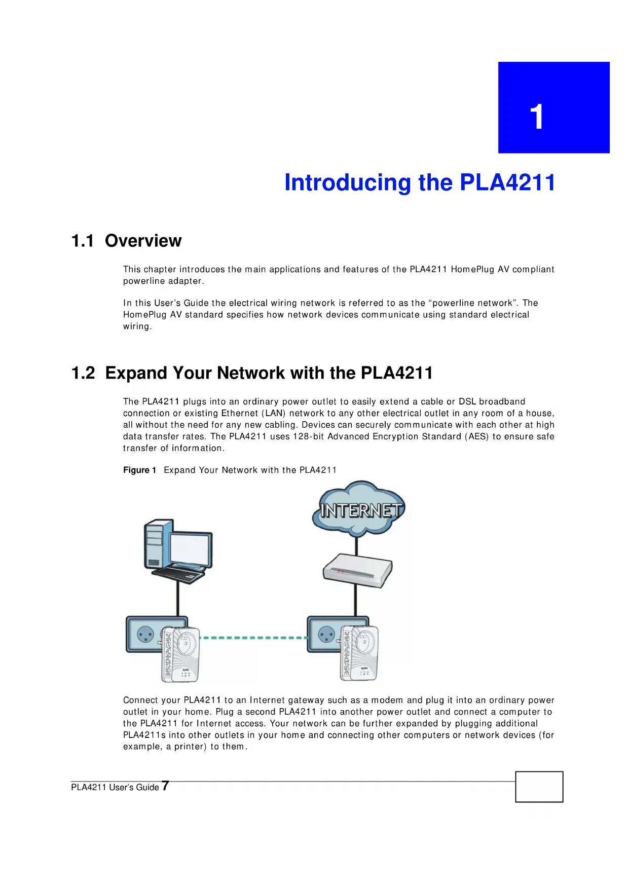 The PLA4211 plugs into an ordinary power outlet to easily extend a cable or DSL broadband connection or existing Ethernet (LAN) network to any other electrical outlet in any room of a house, all without the need for any new cabling. Devices can securely communicate with each other at high data transfer rates. The PLA4211 uses 128-bit Advanced Encryption Standard (AES) to ensure safe transfer of information. Figure 1 Expand Your Network with the PLA4211 Connect your PLA4211 to an Internet gateway such as a modem and plug it into an ordinary power outlet in your home. Plug a second PLA4211 into another power outlet and connect a computer to the PLA4211 for Internet access. Your network can be further expanded by plugging additional PLA4211s into other outlets in your home and connecting other computers or network devices (for example, a printer) to them.Chapter 1 Introducing the PLA4211 PLA4211 User’s Guide