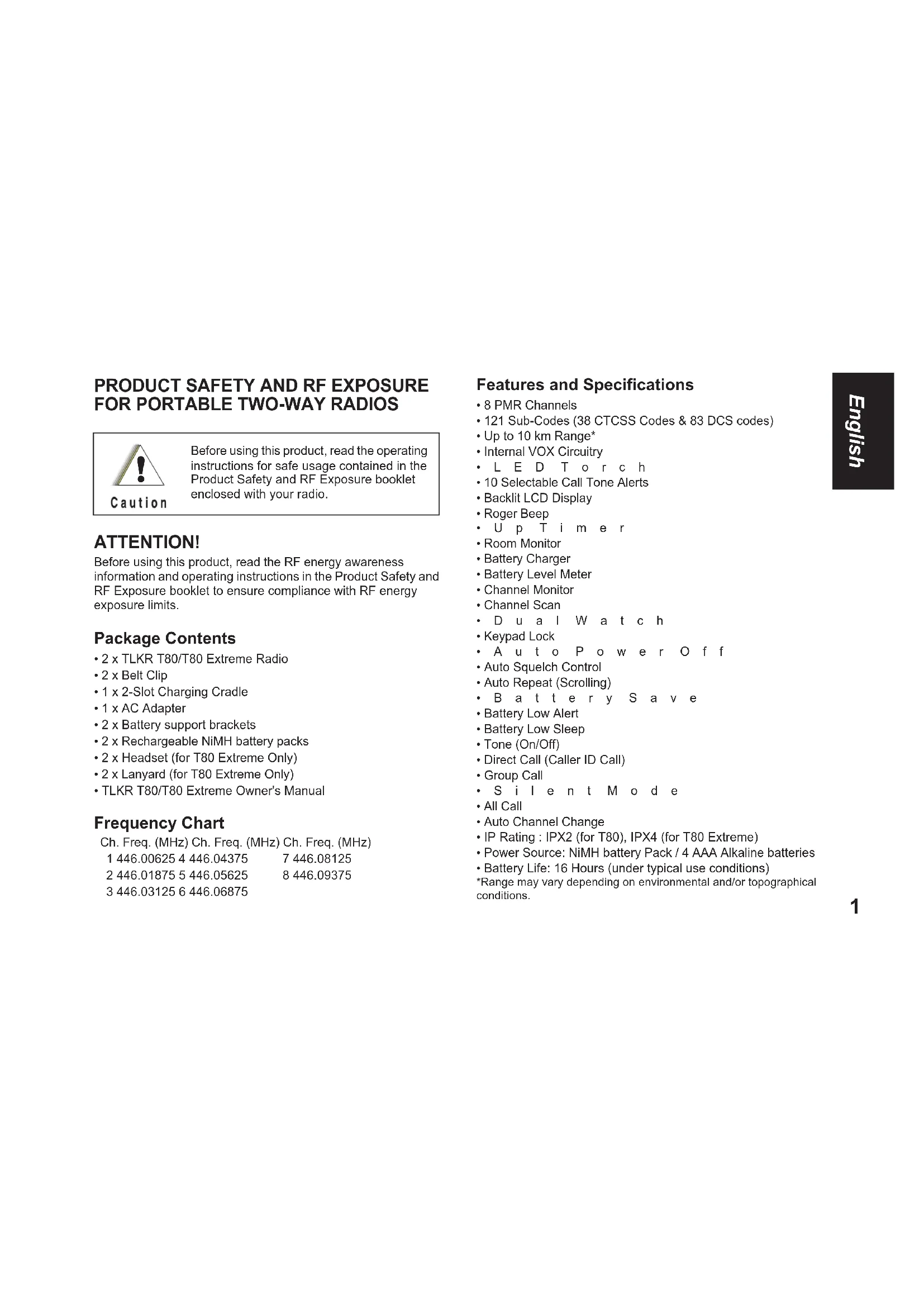- 8 PMR Channels• 121 Sub-Codes (38 CTCSS Codes & 83 DCS codes)• Up to 10 km Range*• Internal VOX Circuitry•LED Torch• 10 Selectable Call Tone Alerts• Backlit LCD Display• Roger Beep•Up Timer• Room Monitor• Battery Charger• Battery Level Meter• Channel Monitor• Channel Scan•Dual Watch• Keypad Lock•Auto Power Off • Auto Squelch Control• Auto Repeat (Scrolling)•Battery Save• Battery Low Alert• Battery Low Sleep• Tone (On/Off)• Direct Call (Caller ID Call)• Group Call•Silent Mode• All Call• Auto Channel Change• IP Rating : IPX2 (for T80), IPX4 (for T80 Extreme)• Power Source: NiMH battery Pack / 4 AAA Alkaline batteries• Battery Life: 16 Hours (under typical use conditions)*Range may vary depending on environmental and/or topographical conditions.Before using this product, read the operating instructions for safe usage contained in the Product Safety and RF Exposure booklet enclosed with your radio.Ch. Freq. (MHz) Ch. Freq. (MHz) Ch. Freq. (MHz)1 446.00625 4 446.04375 7 446.081252 446.01875 5 446.05625 8 446.093753 446.03125 6 446.06875