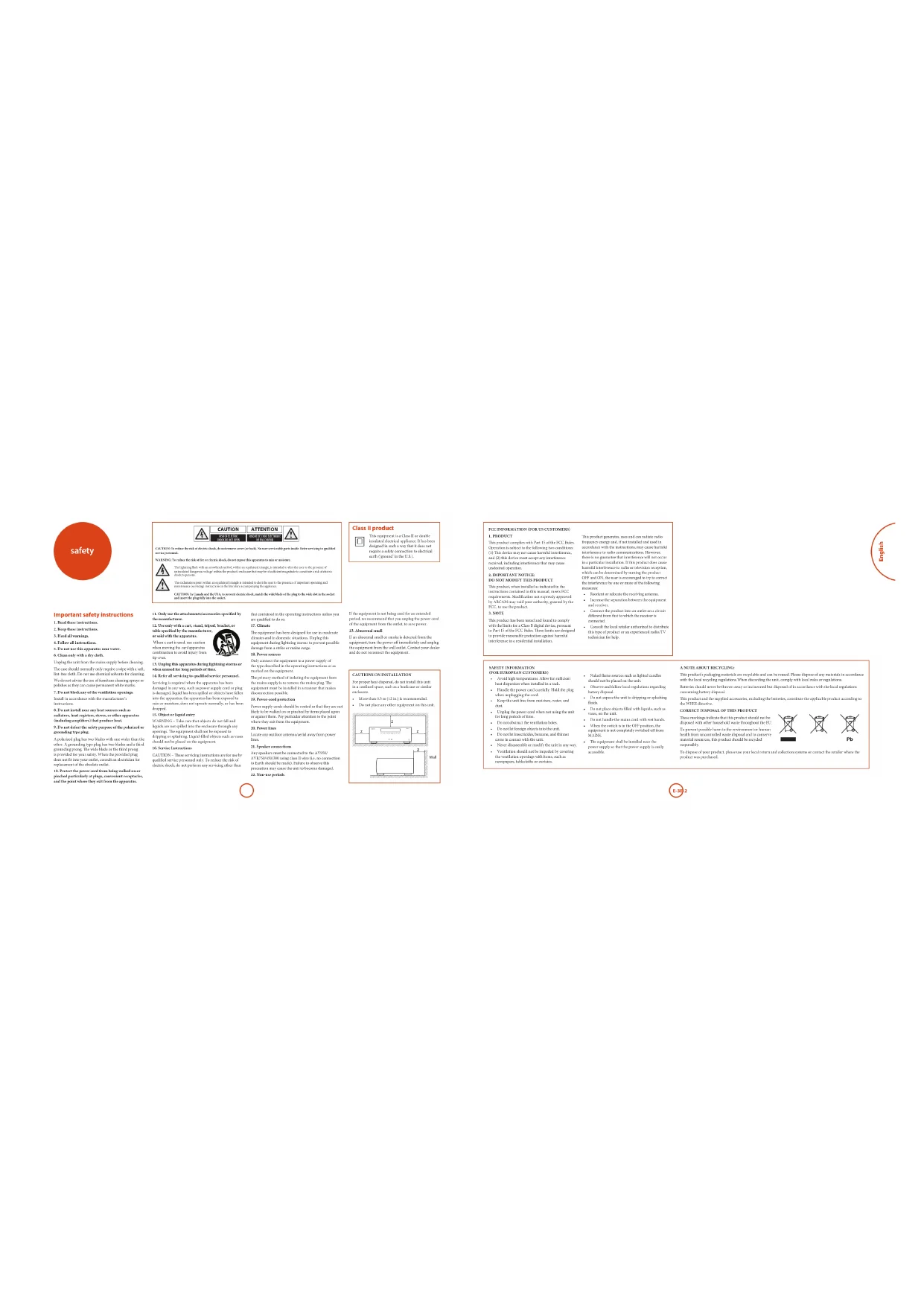 CAUTION: To reduce the risk of electric shock, do not remove cover (or back). No user serviceable parts inside. Refer servicing to qualified service personnel.WARNING: To reduce the risk of fire or electric shock, do not expose this apparatus to rain or moisture. The lightning flash with an arrowhead symbol, within an equilateral triangle, is intended to alert the user to the presence of uninsulated ‘dangerous voltage’ within the product’s enclosure that may be of sufficient magnitude to constitute a risk of electric shock to persons. The exclamation point within an equilateral triangle is intended to alert the user to the presence of important operating and maintenance (servicing) instructions in the literature accompanying the appliance. CAUTION: In Canada and the USA, to prevent electric shock, match the wide blade of the plug to the wide slot in the socket and insert the plug fully into the socket. Class II product is equipment is a Class II or double insulated electrical appliance. It has been designed in such a way that it does not require a safety connection to electrical earth (‘ground’ in the U.S.).