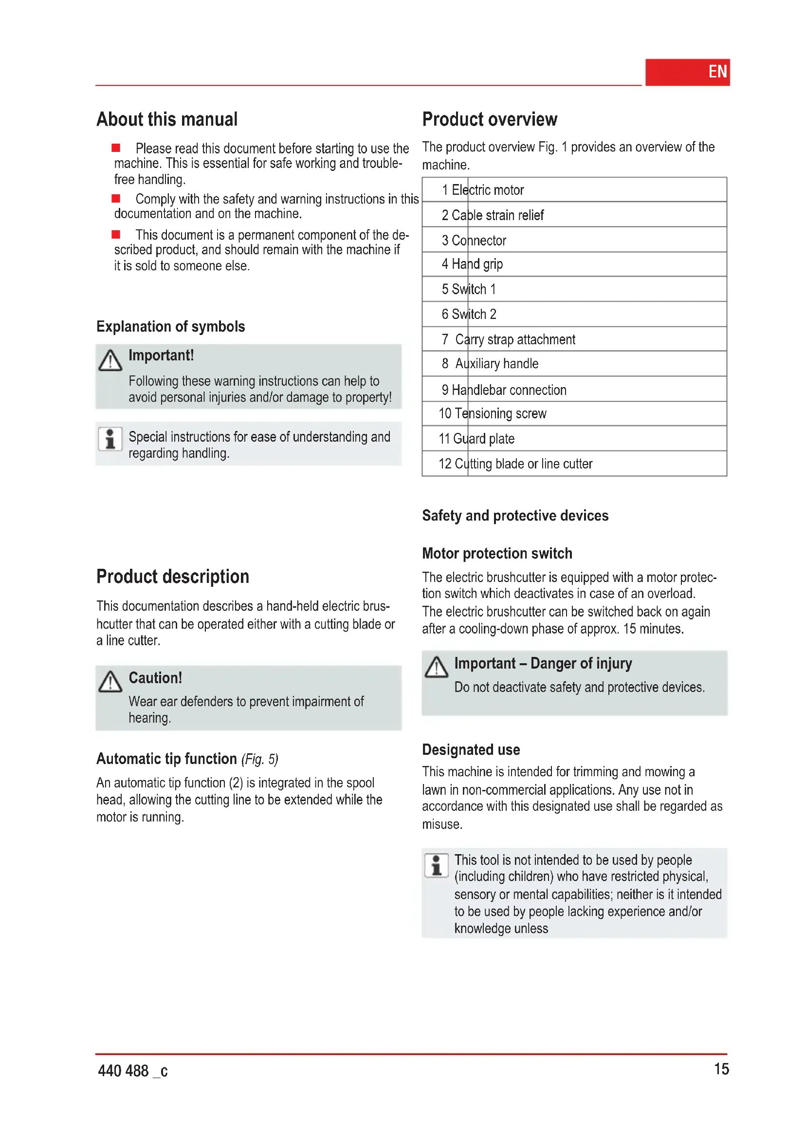 440 488 _c About this manual Please read this document before starting to use the machine. This is essential for safe working and trouble- free handling. Comply with the safety and warning instructions in this documentation and on the machine. This document is a permanent component of the de- scribed product, and should remain with the machine if it is sold to someone else. Explanation of symbols Important! Following these warning instructions can help to avoid personal injuries and/or damage to property! Special instructions for ease of understanding and regarding handling. Product description This documentation describes a hand-held electric brus- hcutter that can be operated either with a cutting blade or a line cutter. Caution! Wear ear defenders to prevent impairment of hearing. Automatic tip function (Fig. 5) An automatic tip function (2) is integrated in the spool head,allowingthecuttinglinetobeextendedwhilethe motor is running. Product overview The product overview Fig. 1 provides an overview of the machine. 1 Electric motor 2 Cable strain relief 3 Connector 4 Hand grip 5 Switch 1 6 Switch 2 7 Carry strap attachment 8 Auxiliaryhandle 9 Handlebar connection 10 Tensioning screw 11 Guard plate 12 Cutting blade or line cutter Safety and protective devices Motor protection switch The electric brushcutter is equipped with a motor protec- tion switch which deactivates in case of an overload. The electric brushcutter can be switched back on again afteracooling-downphaseofapprox.15minutes. Important – Danger of injury Do not deactivate safety and protective devices. Designated use This machine is intended for trimming and mowing a lawn in non-commercial applications. Any use not in accordance with this designated use shall be regarded as misuse. This tool is not intended to be used by people (including children) who have restricted physical, sensory or mental capabilities; neither is it intended tobeusedbypeoplelackingexperienceand/or knowledge unless16 Original instructions for use Important! The machine is not allowed to be used in commer- cial applications. Meaning of the symbols on the machine Important! Read the instructions for use Wear protective glasses and ear defenders Wear protective gloves Wear safety boots Keep people away. Safety distance min. 10 m Danger due to objects being thrown out Immediately disconnect the plug from themainsiftheextensioncablehas been damaged or cut Protect the machine against rain and moisture Make sure there is a gap of at least 15 m between the machine and other people Safety notes Important! The cutting tool continues to rotate even after the motor has been switched off! Beforeusingmainsandextensioncables,checkthem for any signs of damage or ageing. Keepextensioncablesawayfromthecuttingtools. If the cable becomes damaged during use, immediate- ly disconnect from the mains. DO NOT TOUCH THE CABLE UNTIL IT HAS BEEN DISCONNECTED FROM THE MAINS. Wear suitable clothing, eye protection and gloves. Never allow children or uninstructed persons to opera- te or maintain the machine. Local regulations may spe- cify the minimum age of people operating the machine. Stop using the machine when people, especially child- ren (and also pets) are in the vicinity. Onlymowduringdaylighthoursorwithgoodarticial lighting. Before taking the machine into operation, and following any impact, check the machine for signs of wear or da- mage and undertake the necessary repairs. Never use the machine if any protective devices are damaged or missing. Always keep hand and feet away from the cutting de- vice, above all when switching on the motor. Any device that is used for cutting off the line repre- sents a danger of injury. After pulling out a new line, always hold the machine in its normal working position before switching it on. Only use genuine spare parts and genuine accesso- ries. Disconnect the mains plug before carrying out any checks, cleaning or work on the machine, and when it is not in use. Make sure that air openings are free from contami- nation. In spite of technical and additional protective measu- res, there is always a residual risk when working with the machine. Keep handles dry and clean. Remove foreign bodies from the working area. Only use the machine if it is in perfect technical con- dition. Always keep the guard plate, spool head and motor clear of mowing residues. Keep your body and clothing away from the blade system. they are supervised by someone who is respon- sible for safety, or receive instructions from this supervisory person in how to operate the tool. Children should be supervised in order to make sure that they do not play with the tool.17