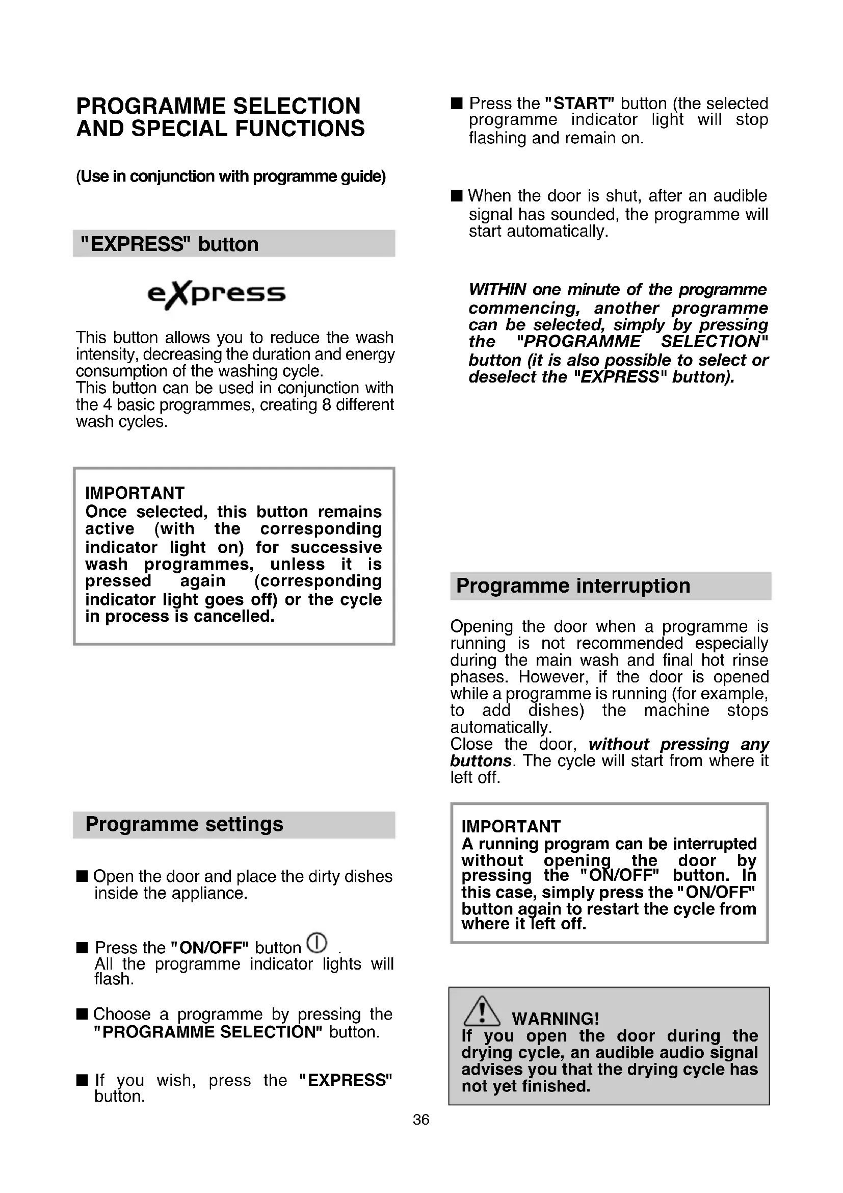 (Use in conjunction with programme guide) "EXPRESS" button This button allows you to reduce the wash intensity, decreasing the duration and energy consumption of the washing cycle. This button can be used in conjunction with the 4 basic programmes, creating 8 different wash cycles. IMPORTANT Once selected, this button remains active (with the corresponding indicator light on) for successive wash programmes, unless it is pressed again (corresponding indicator light goes off) or the cycle in process is cancelled. Programme settings ■ Open the door and place the dirty dishes inside the appliance. ■ Press the "ON/OFF" button . All the programme indicator lights will flash. ■ Choose a programme by pressing the "PROGRAMME SELECTION" button. ■ If you wish, press the "EXPRESS" button. ■ Press the "START" button (the selected programme indicator light will stop flashing and remain on. ■ When the door is shut, after an audible signal has sounded, the programme will start automatically. WITHIN one minute of the programme commencing, another programme can be selected, simply by pressing the "PROGRAMME SELECTION" button (it is also possible to select or deselect the "EXPRESS" button). Programme interruption Opening the door when a programme is running is not recommended especially during the main wash and final hot rinse phases. However, if the door is opened while a programme is running (for example, to add dishes) the machine stops automatically. Close the door, without pressing any buttons. The cycle will start from where it left off. IMPORTANT A running program can be interrupted without opening the door by pressing the "ON/OFF" button. In this case, simply press the "ON/OFF" button again to restart the cycle from where it left off. WARNING! If you open the door during the drying cycle, an audible audio signal advises you that the drying cycle has not yet finished.37 Changing a running programme Proceed as follows to change or cancel a running program: ■ Hold the "RESET" button down for at least 5 seconds. The programme indicator lights will turn on and off individually and sequentially and some audible signals will sound. ■ The running programme will be cancelled and all the programme indicator lights will flash. ■ At this point a new programme can be set. WARNING! Before starting a new programme, you should check that there is still detergent in the dispenser. If necessary, top up the dispenser. Programme operations When a programme is running the relevant indicator light will remain on and the 3 “PROGRAMME STATUS” indicator lights ("WASH" , "DRY" , and "END" ) will light singularly and in sequence to indicate the current phase. If there is any break in the power supply while the dishwasher is operating, a special memory stores the selected programme and, when the power is restored, it continues where it left off. Programme end A 5 second alarm will sound (if not muted) 3 times at 30 second intervals to signal that the programme has ended. The programme end indicator light will turn on, while all the others indicator lights will turn off. Dishes can now be removed and the dishwasher turned off by pressing the "ON/OFF" button or dishes can be loaded for new cycle "DELAY START" button The dishwasher start time can be set with this button, delaying the start by 3, 6 or 9 hours. Proceed as follows to set a delayed start: ■ Press the "DELAY START" button (each time the button is pressed the start will be delayed by 3, 6 or 9 hours respectively and the corresponding time indicator light will illuminate). ■ To start the countdown, press the "START" button (the selected programme indicator light will come on, while the set time indicator light will start to flash). If a 9 hour delay is set, countdown will be displayed by the 6h indicator light after 3 hours and the 3h indicator light after 6 hours. At the end of the last 3 hours (at the end of countdown) the 3h indicator light will stop flashing and remain on to indicate the washing phase and the programme will start automatically. If countdown has not ended, whereby the programme has not yet started, it is possible to change or cancel the delayed start and select another programme or to select/deselect the option button, proceeding as follows: ■ Hold the "RESET" button down for at least 5 seconds. The programme indicator lights will turn on and off individually and sequentially and some audible signals will sound. ■ The delayed start and the selected programme will be cancelled. The programme indicator lights will flash. ■ Press the "DELAY START" button to set another delayed start time (the corresponding indicator light will turn on). ■ A new programme can be set after a delayed time has been changed or cancelled or an option button can be selected or deselected.38 Alarm mute for the PROGRAMME END The alarm for the programme end may be muted as follows: IMPORTANT The dishwasher must ALWAYS be off before start of this procedure.