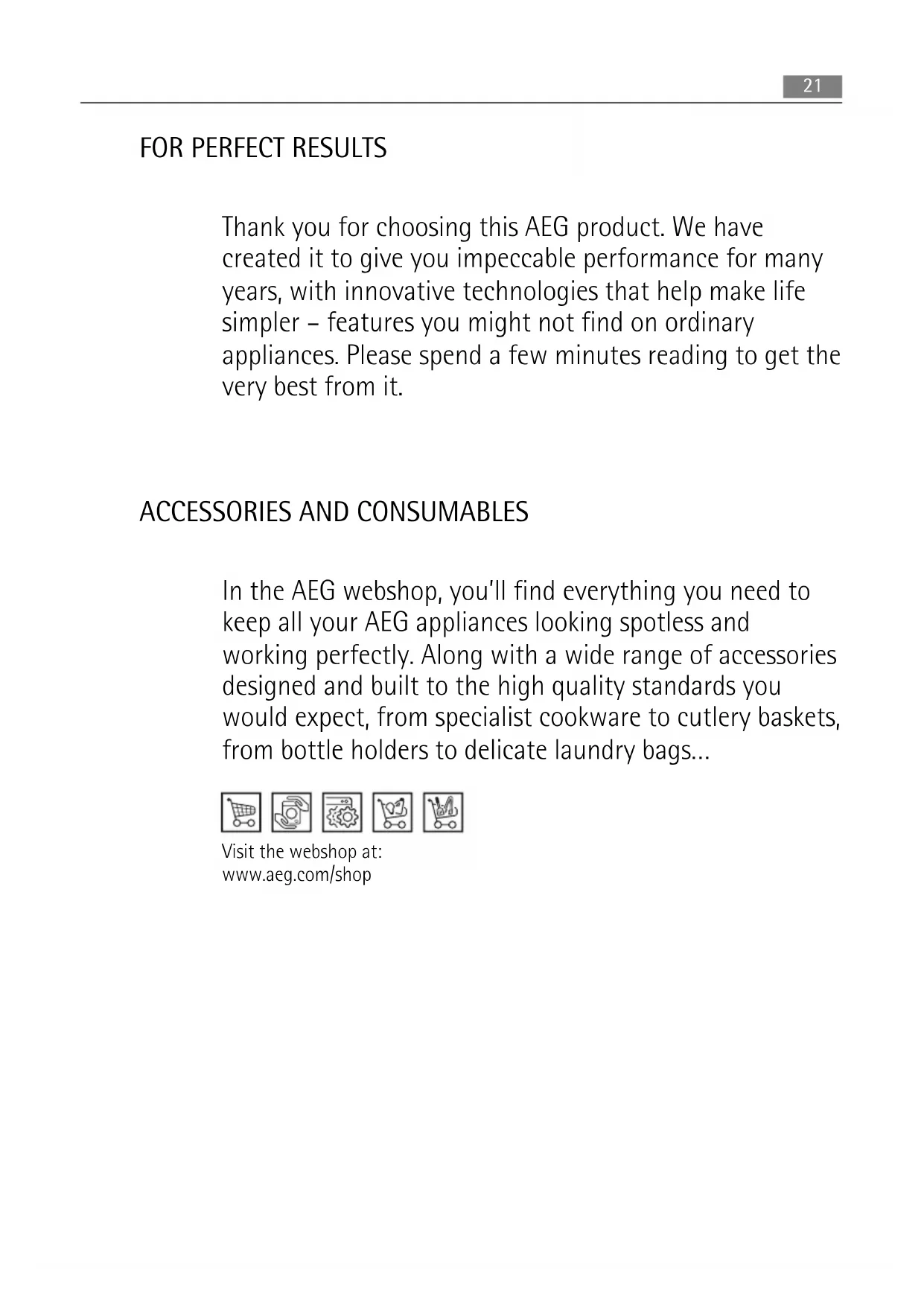 In the AEG webshop, you’ll find everything you need to keep all your AEG appliances looking spotless and working perfectly. Along with a wide range of accessories designed and built to the high quality standards you would expect, from specialist cookware to cutlery baskets, from bottle holders to delicate laundry bags… Visit the webshop at: www.aeg.com/shop 21CONTENTS 23 Safety information 25 Control panel 28 First use 29 Daily use 30 Helpful hints and tips 31 Care and cleaning 32 What to do if… 34 Technical data 34 Installation 38 Environmental concerns The following symbols are used in this user manual: Important information concerning your personal safety and information on how to avoid damaging the appliance. General information and tips Environmental information Subject to change without notice 22 ContentsSAFETY INFORMATION In the interest of your safety and to ensure the correct use, before installing and first using the appliance, read this user manual carefully, including its hints and warnings. To avoid unnecessary mistakes and accidents, it is important to ensure that all people using the ap- pliance are thoroughly familiar with its operation and safety features. Save these instruc- tions and make sure that they remain with the appliance if it is moved or sold, so that ev- eryone using it through its life will be properly informed on appliance use and safety. For the safety of life and property keep the precautions of these user's instructions as the manufacturer is not responsible for damages caused by omission. Children and vulnerable people safety