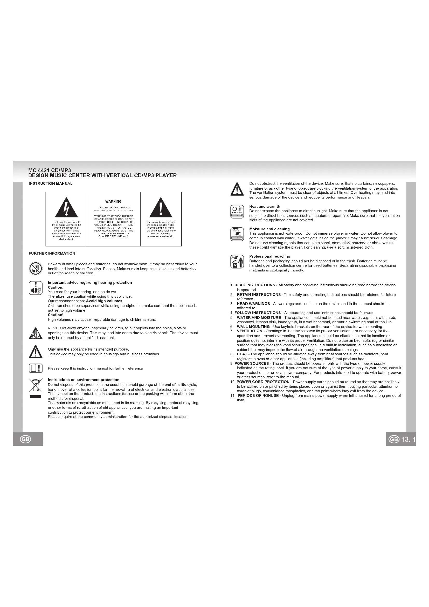 QUALIFIED TECHNICIANS. Please keep this instruction manual for further reference Do not obstruct the ventilation of the device. Make sure, that no curtains, newspapers, furniture or any other type of object are blocking the ventilation system of the apparatus. The ventilation system must be clear of objects at all times! Overheating may lead into serious damage of the device and reduce its performance and lifespan. Heat and warmth Do not expose the appliance to direct sunlight. Make sure that the appliance is not subject to direct heat sources such as heaters or open fire. Make sure that the ventilation slots of the appliance are not covered. Moisture and cleaning This appliance is not waterproof! Do not immerse player in water. Do not allow player to come in contact with water. If water gets inside the player it may cause serious damage. Do not use cleaning agents that contain alcohol, ammoniac, benzene or abrasives as these could damage the player. For cleaning, use a soft, moistened cloth. Instructions on environment protection Do not dispose of this product in the usual household garbage at the end of its life cycle; hand it over at a collection point for the recycling of electrical and electronic appliances. The symbol on the product, the instructions for use or the packing will inform about the methods for disposal. The materials are recyclable as mentioned in its marking. By recycling, material recycling or other forms of re-utilization of old appliances, you are making an important contribution to protect our environment. Please inquire at the community administration for the authorized disposal location. NEVER let allow anyone, especially children, to put objects into the holes, slots or openings on this devise. This may lead into death due to electric shock. The device must only be opened by a qualified assistant. Beware of small pieces and batteries, do not swallow them. It may be hazardous to your health and lead into suffocation. Please, Make sure to keep small devices and batteries out of the reach of children. Important advice regarding hearing protection Caution: You care for your hearing, and so do we. Therefore, use caution while using this appliance. Our recommendation: Avoid high volumes. Children should be supervised while using headphones; make sure that the appliance is not set to high volume Caution! High volumes may cause irreparable damage to children’s ears. Only use the appliance for its intended purpose. This device may only be used in housings and business premises. Professional recycling Batteries and packaging should not be disposed of in the trash. Batteries must be handed over to a collection centre for used batteries. Separating disposable packaging materials is ecologically friendly. MC 4421 CD/MP3 DESIGN MUSIC CENTER WITH VERTICAL CD/MP3 PLAYER15. 14.