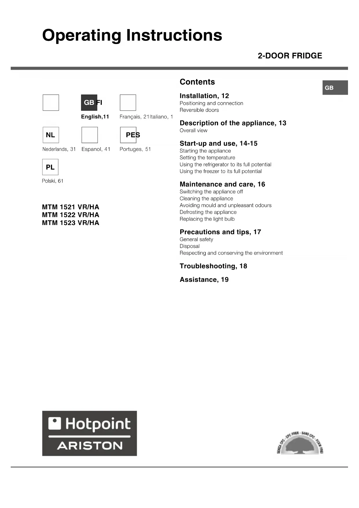 MTM 1521 VRHA - Fridge HOTPOINT ARISTON - Free user manual and instructions