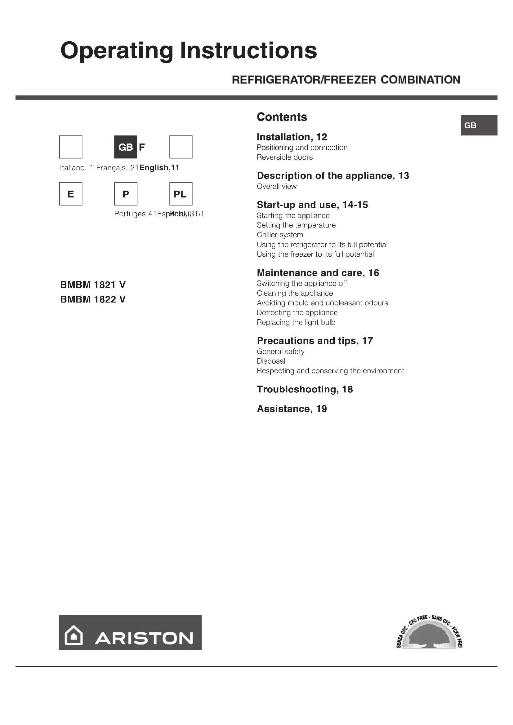 Contents Installation, 12 Positioning and connection Reversible doors Description of the appliance, 13 Overall view Start-up and use, 14-15 Starting the appliance Setting the temperature Chiller system Using the refrigerator to its full potential Using the freezer to its full potential Maintenance and care, 16 Switching the appliance off Cleaning the appliance Avoiding mould and unpleasant odours Defrosting the appliance Replacing the light bulb Precautions and tips, 17 General safety Disposal Respecting and conserving the environment Troubleshooting, 18 Assistance, 19 Operating Instructions BMBM 1821 V BMBM 1822 V Italiano, 1 Français, 21English,11 GBI F Portuges,41Espanol, 31