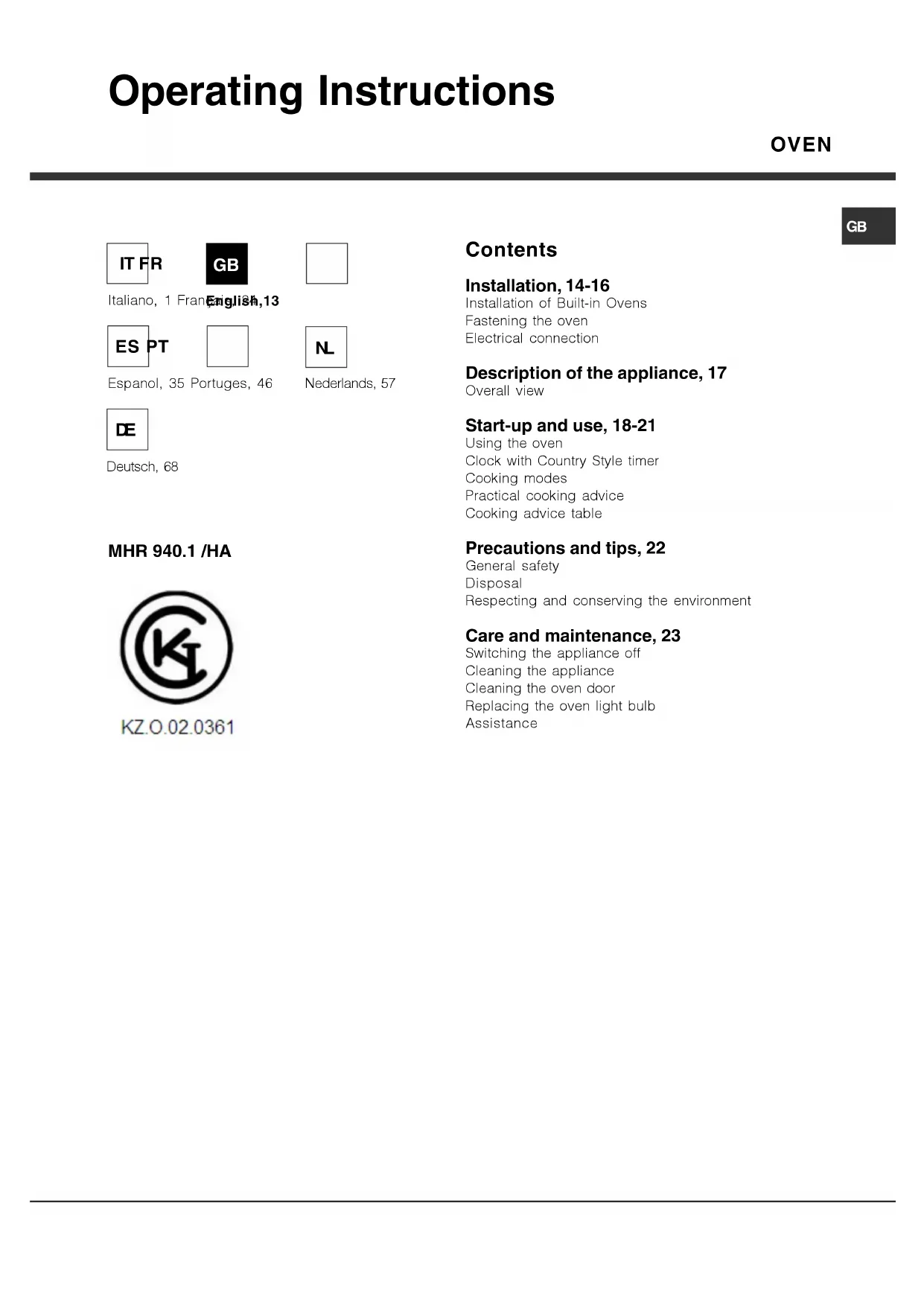 Deco MHR 940.1 (OW) HA - Oven HOTPOINT ARISTON - Free user manual and instructions