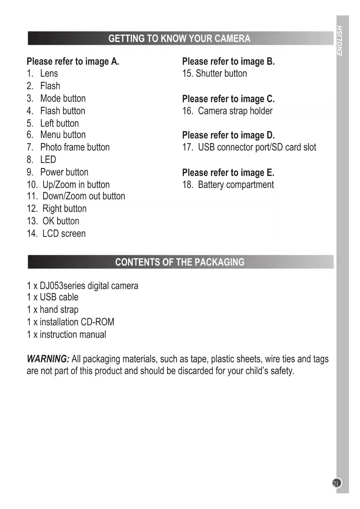 WARNING: All packaging materials, such as tape, plastic sheets, wire ties and tags