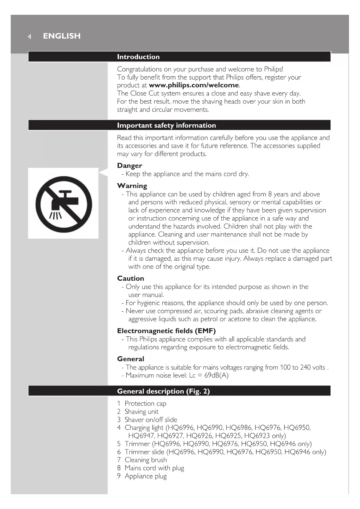 - Maximum noise level: Lc = 69dB(A) General description (Fig. 2) 1 Protection cap 2 Shaving unit 3 Shaver on/off slide 4 Charging light (HQ6996, HQ6990, HQ6986, HQ6976, HQ6950, HQ6947, HQ6927, HQ6926, HQ6925, HQ6923 only) 5 Trimmer (HQ6996, HQ6990, HQ6976, HQ6950, HQ6946 only) 6 Trimmer slide (HQ6996, HQ6990, HQ6976, HQ6950, HQ6946 only) 7 Cleaning brush 8 Mains cord with plug 9 Appliance plug ENGLISHCharging Charge the appliance: - before rst use and when you have not used the appliance for a long time - when the motor stops or starts running slower When you have charged the shaver for the rst time and after a long period of disuse, optimise the battery capacity in the following way: 1 Fully charge the shaver and then use it normally until the battery is completely empty. Repeat this process two more times. If you optimise the battery capacity in this way, you can also charge the shaver in between shaves, even if the battery is not completely empty yet. Charging the shaver (HQ6996, HQ6990, HQ6986, HQ6976, HQ6950, HQ6947, HQ6927, HQ6926, HQ6925, HQ6923 only) Quick charge (HQ6996, HQ6990, HQ6986 only) After the shaver has charged for 3 minutes, it contains enough energy for one cordless shave. Charging with the adapter 1 Put the appliance plug in the shaver. 2 Put the mains plug in the wall socket. Note: Make sure the shaver is switched off. , The charging light goes on. , HQ6996, HQ6990, HQ6986: Charge the shaver for at least 1 hour, but not more than 24 hours. When the battery is fully charged, the charging light starts ashing. , HQ6976, HQ6950, HQ6947, HQ6927, HQ6926, HQ6925, HQ6923: Charge the shaver for at least 8 hours, but not more than 24 hours. The charging light lights up continuously as long as the appliance is connected to the mains. Note: Do not leave the shaver connected to the mains continuously. Note: You can also shave without charging. Simply connect the shaver to the mains. 3 Remove the mains plug from the wall socket and pull the appliance plug out of the shaver when the battery is fully charged. Using the appliance HQ6996, HQ6990, HQ6986, HQ6976, HQ6950, HQ6947, HQ6927, HQ6926, HQ6925, HQ6923 only: You can use the shaver directly from the mains but also without a cord. HQ6946, HQ6906, HQ6902: You can only use the shaver directly from the mains. Preparing for use (HQ6946, HQ6906, HQ6902 only) 1 Put the appliance plug in the shaver. 2 Put the mains plug in the wall socket. ENGLISH 5Shaving 1 Push the on/off slide upwards to switch on the shaver. 2 Move the shaving heads over your skin. Make circular movements. Shaving on a dry face gives the best results. Your skin may need 2 or 3 weeks to get accustomed to the Philips shaving system. 3 Push the on/off slide downwards to switch off the shaver. 4 Put the protection cap on the shaver every time you have used it, to prevent damage. Trimming (HQ6996, HQ6990, HQ6976, HQ6950, HQ6946 only) You can use the trimmer to trim your sideburns and moustache. 1 Push the trimmer slide upwards to open the trimmer. The trimmer can be activated while the motor is running. Cleaning and maintenance Regular cleaning guarantees better shaving performance. This appliance is not washable. Never immerse the appliance in water, nor rinse it under the tap. Never use scouring pads, abrasive cleaning agents or aggressive liquids such as petrol or acetone to clean the appliance. - For easy and optimal cleaning, Philips Shaving Head Cleaning Spray (type no. HQ110) is available. Ask your Philips dealer for information. Note: Philips Shaving Head Cleaning Spray may not be available in all countries. Contact the Consumer Care Centre in your country about the availability of this accessory. You can also clean the shaver in the following way: ENGLISH6Every week: shaving unit and hair chamber 1 Switch off the shaver. Remove the mains plug from the wall socket and pull the appliance plug out of the shaver. 2 Cleanthetopoftheappliancerst.Usethecleaningbrushsupplied. 3 Press the release button (1) and remove the shaving unit (2). 4 Clean the inside of the shaving unit and the hair chamber with the cleaning brush. 5 Put the shaving unit back onto the shaver.