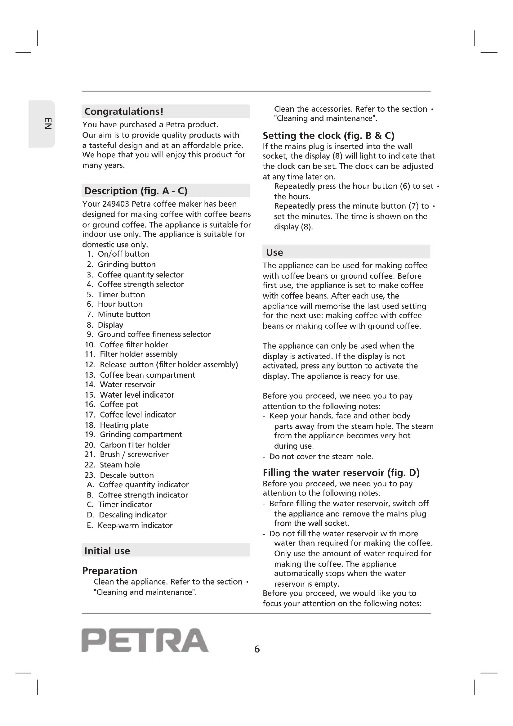 Congratulations! You have purchased a Petra product. Our aim is to provide quality products with a tasteful design and at an affordable price. We hope that you will enjoy this product for many years. Description (fig. A - C) Your 249403 Petra coffee maker has been designed for making coffee with coffee beans or ground coffee. The appliance is suitable for indoor use only. The appliance is suitable for domestic use only.