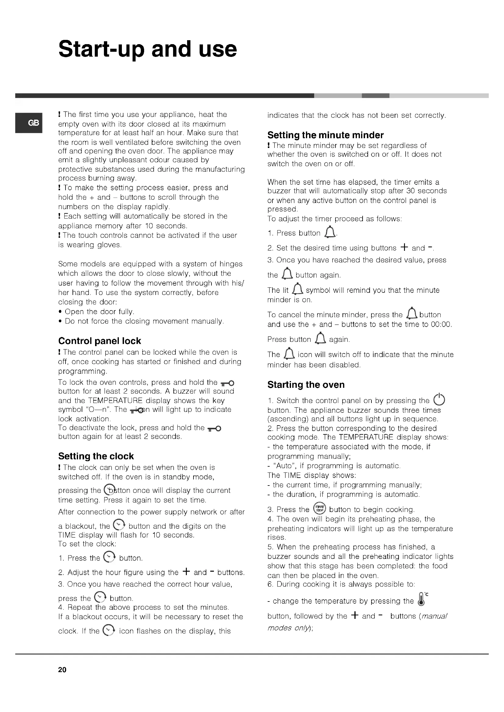 the button again. The lit symbol will remind you that the minute minder is on. To cancel the minute minder, press the button and use the + and – buttons to set the time to 00:00. Press button again. The icon will switch off to indicate that the minute minder has been disabled. Starting the oven